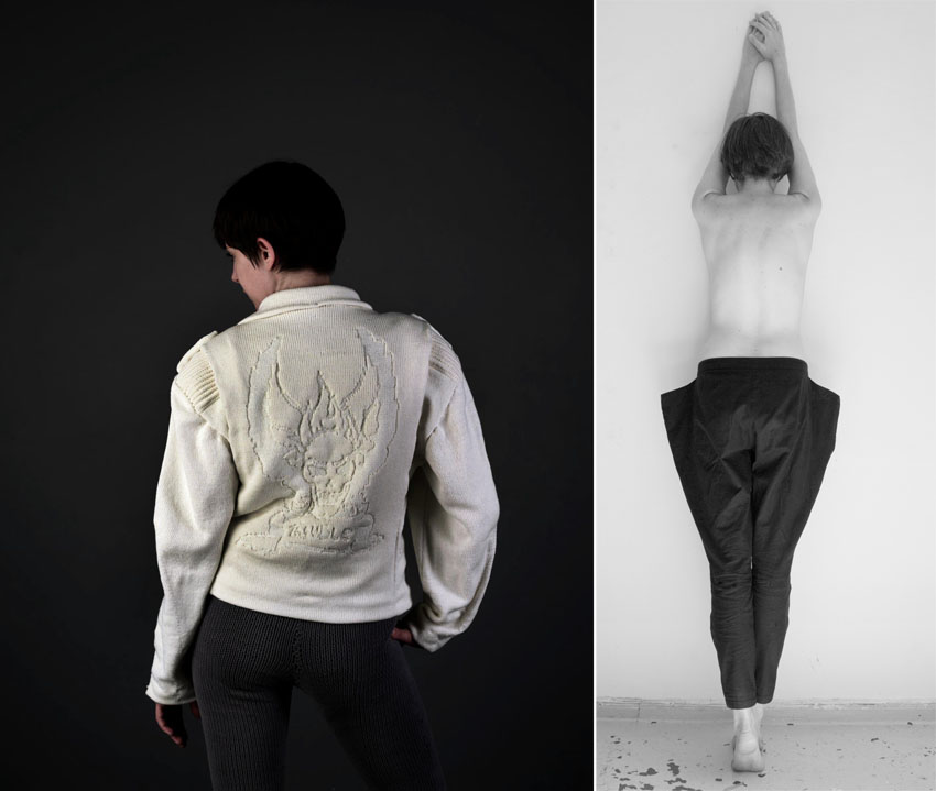 Arriba cazadora y pantalón de la colección Urban Mimikry diseño de Marie Burkhard