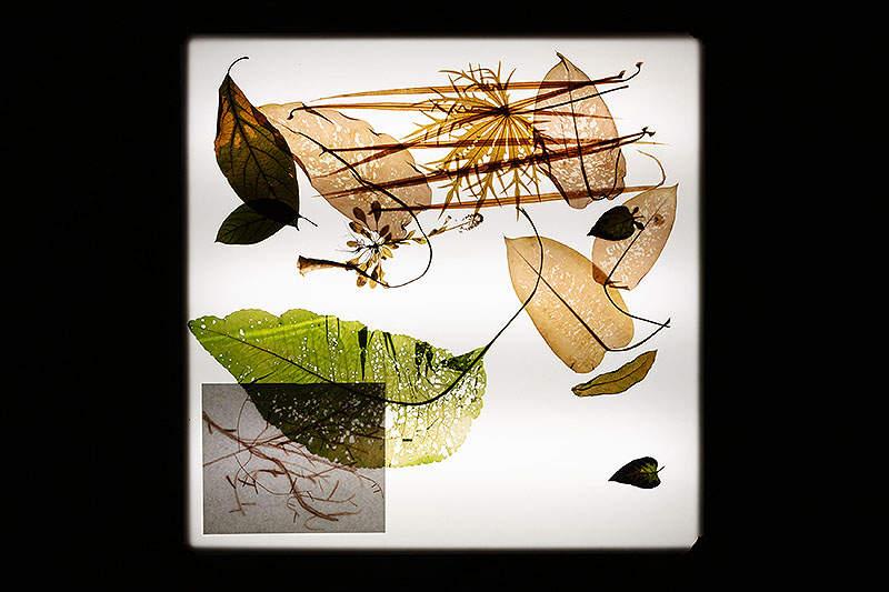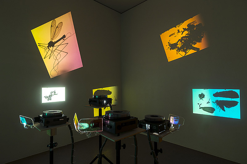 Nuestra obra Mutant and nondurable (2020–) es una colección en crecimiento de exoesqueletos de insectos y otros restos encontrados, ensamblados en monturas de diapositivas de 35 mm, mostrados en una proyección multicanal. Fragmentos de vidrio dicroico en movimiento generan destellos de luz cambiante sobre las estructuras quitinosas de los artrópodos. Utilizamos proyectores obsoletos como parte de nuestra arqueología de medios, ampliando las siluetas de estos seres que desaparecen en masa.