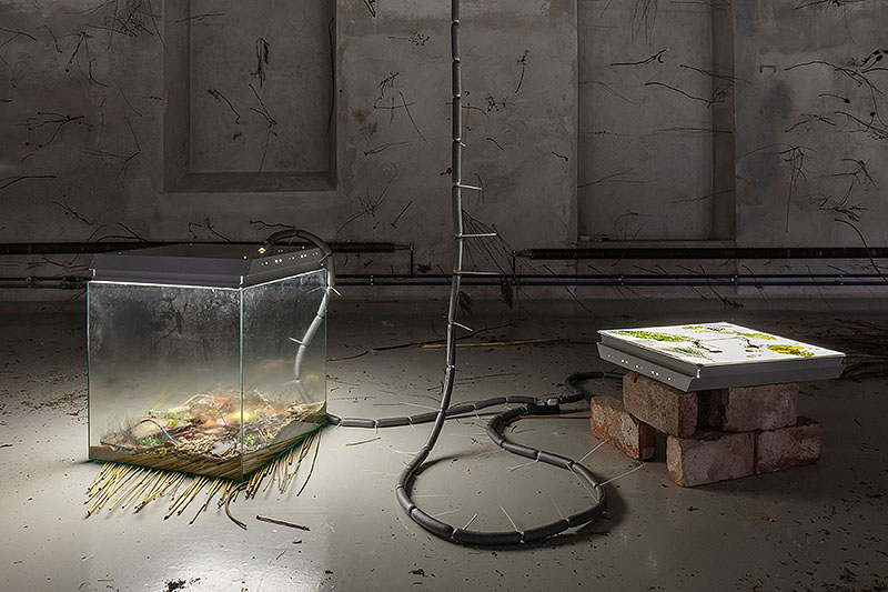 Para nosotros, una exposición no trata de presentar obras aisladas, sino de generar un espacio donde animaciones 3D, objetos artísticos, plantas, restos encontrados, plantas, ratas momificadas o árboles caídos coexistan e interactúan sin jerarquías. Nos gusta pensar que, al disponerse de cierta manera, estos elementos se filtran entre sí. En este intercambio, las nociones tradicionales de valor —el tiempo invertido en un objeto o su origen— pierden relevancia. Una vez dentro, el espacio también puede filtrarse en ti, transformando tu percepción cotidiana.