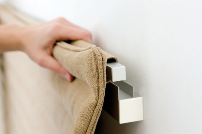 Arriba: El proyecto más curioso es Testa Headboard. Con este nuevo producto Nani Marquina se despega del suelo y se sube por las paredes. Testa es una cabecera para la cama que se sujeta a la pared por un rail. El sistema ha sido diseñado por Gonzalo Milá. Este cabecero se puede utilizar con tres diseños textiles diferentes, Doble-side, Bauma y Spiral (el de la imagen) diseñados por Nani Marquina, Gonzalo Milá y Martín Azua+Gerard Moliné respectivamente