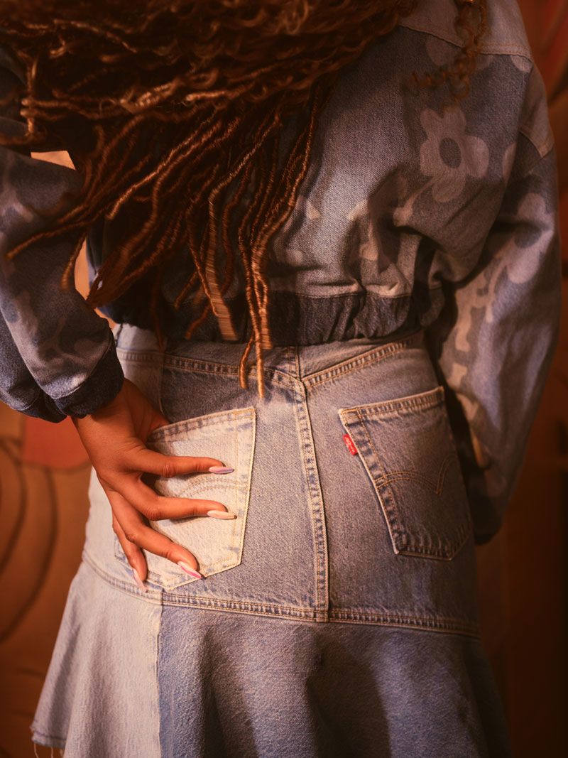 La colección Levi’s x Naomi Osaka se sintetiza en 5 prendas nuevas. Todas confeccionadas, con diferentes acabados, a partir de unos diseños previos de la actual número 1 del tenis femenino. Una de las prendas más memorables de la colección es la falda de cola de sirena con volante asimétrico.