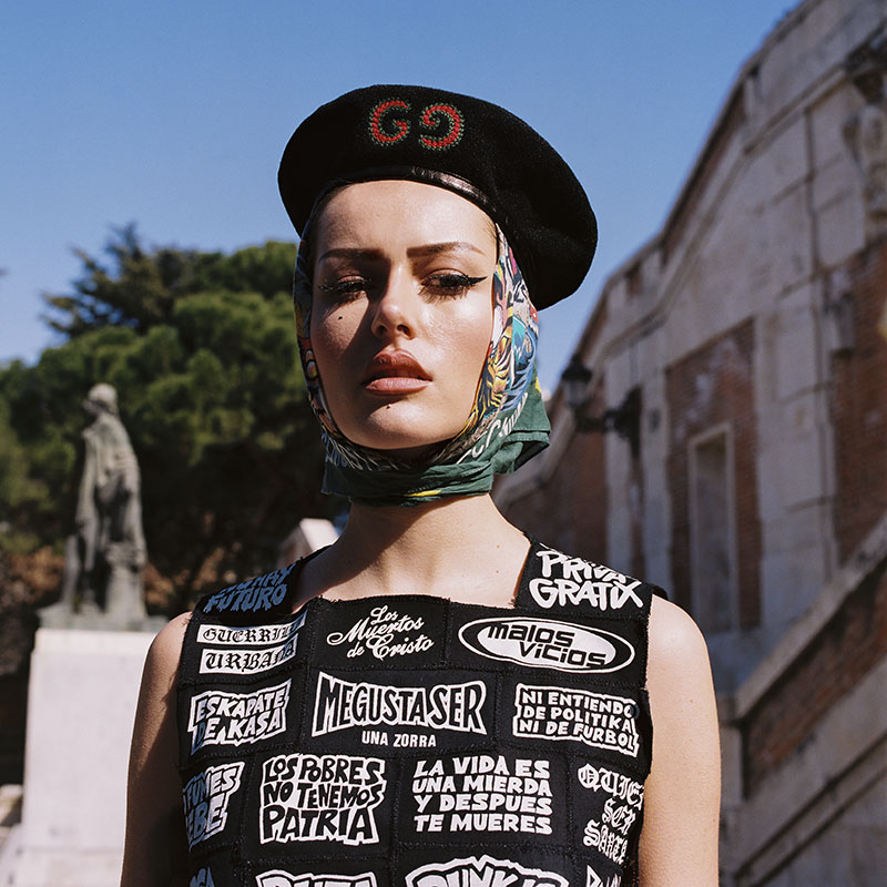 Ner lleva top de Reparto Studio + Pañuelo de Gucci + Boina de Gucci