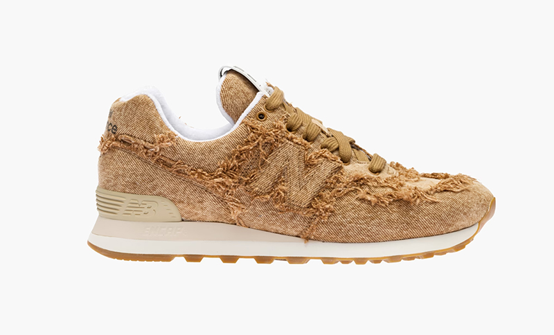 La colaboración de New Balance X Miu Miu nos trae, como estrella de la cápsula, una 574 vestida de denim índigo con contrastes en blanco. Como en sus hermanas, esta zapatilla presenta fraying a lo largo de todos los puntos de costura… jugando con ese look desgastado y DIY. En sintonía con el par en índigo, también tenemos una New Balance 574 construida también en denim; pero de un color poco usual para el tejido: coñac. Se trata de un marrón muy rico que, junto con los desgastes exagerados, crea un juego visual bastante interesante en la zapatilla. En ambos pares, el logo N de New Balance está rematado en ante… para resaltar esa aura premium.