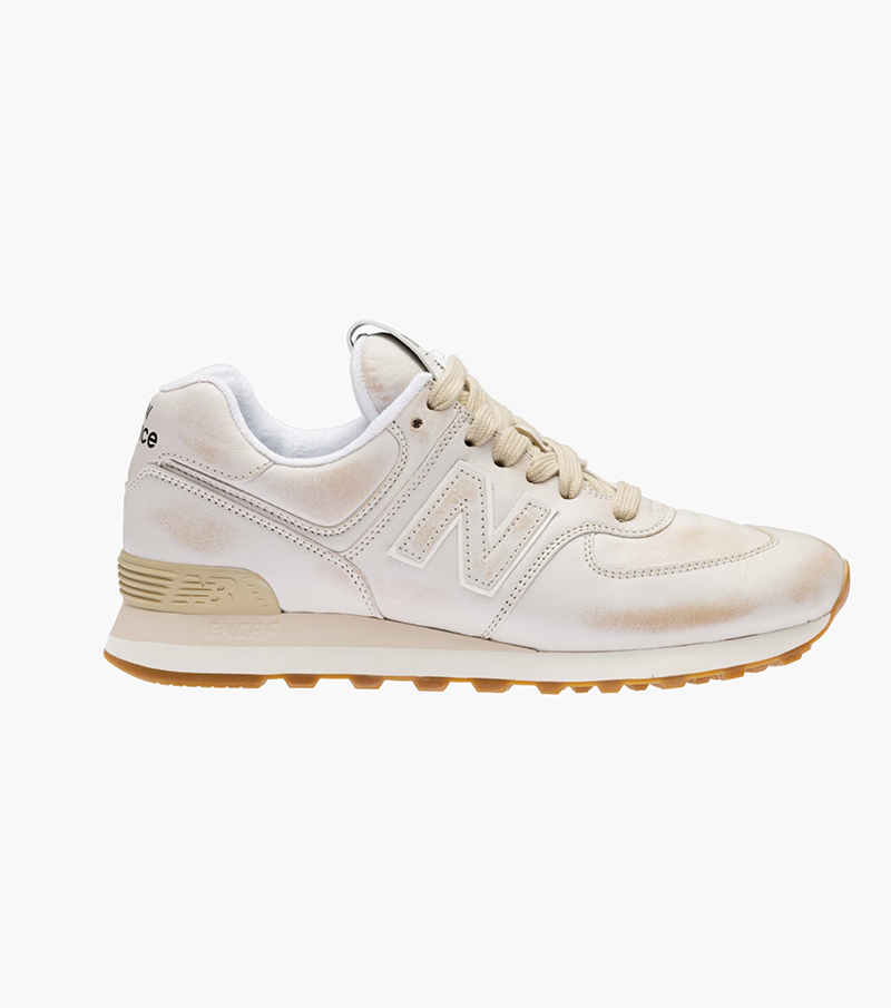 Y si el desgaste no es lo vuestro, y queréis algo más comedido, la segunda unión de New Balance X Miu Miu ofrece una versión de la 574 más limpia. Ahora en piel napa, esta versión de la 574 juega con el look desgastado con raspones y teñidos sobre la piel blanco hueso. Y, ¿qué hay del branding? Tal y como en la colección pasada, se mantiene al mínimo necesario, con un logo conjunto en la lengüeta y nada más; no es como si hiciera falta.