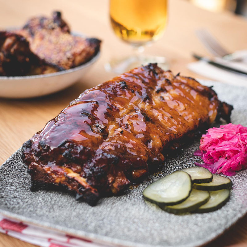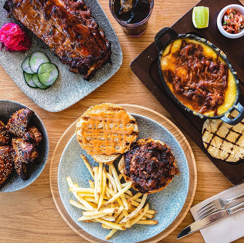 Imágenes superiores: degustación, tacos para compartir y costillas de New York Burger