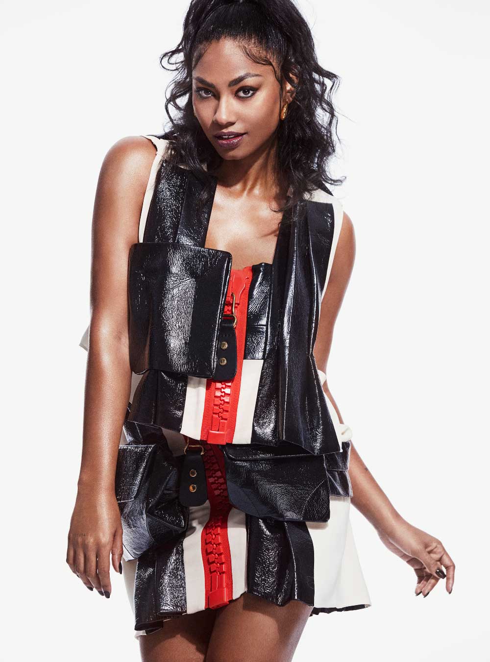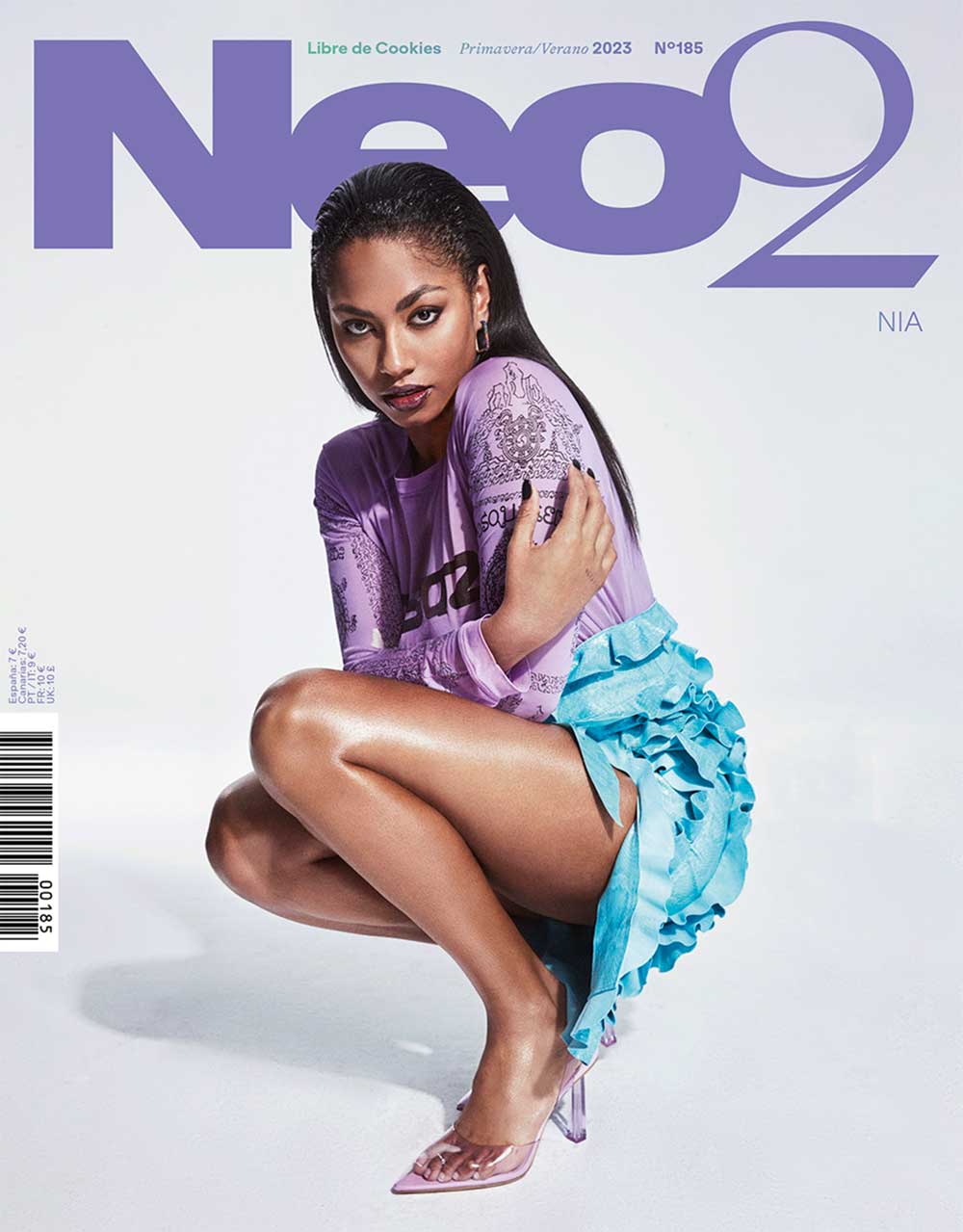 NIA en portada de Neo2 con zapato de tacón Slingback DEICHMANN + Camiseta malva de manga larga y vestido turquesa de volantes DSQUARED2 + Pendiente Rainbow BAROKAH JEWELS + Peluquería con I.C.O.N. PRODUCTS: Mane Control + Airshine