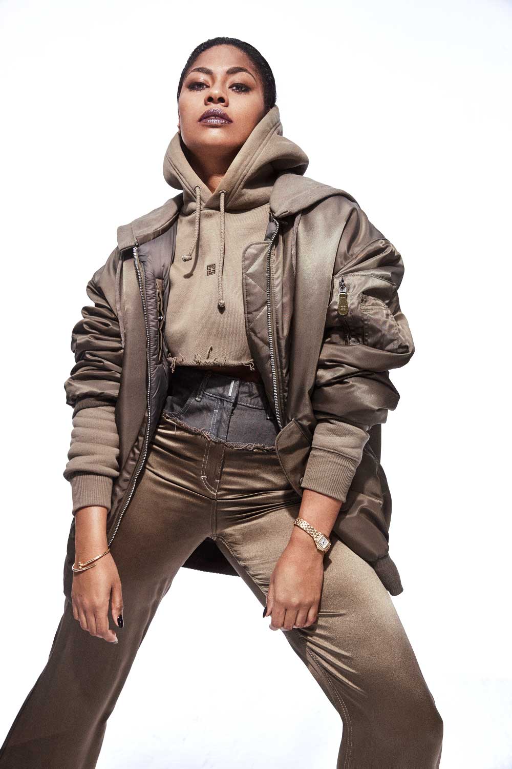 NIA con bomber oversize, hoodie crop top y pantalón satinado GIVENCHY + Pulsera Juste un Clou de oro amarillo y Reloj Panthère de oro CARTIER + Peluquería con I.C.O.N. PRODUCTS: Antidote + India Dry