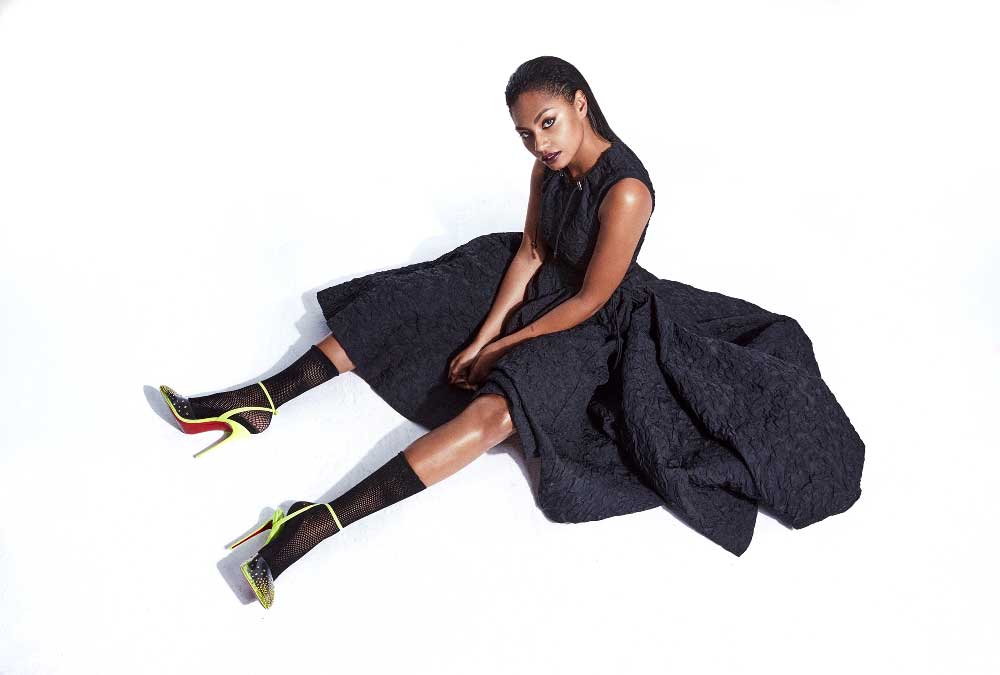 NIA con vestido acampanado y calcetines negros de malla de algodón DIOR + Zapato verde neón CHRISTIAN LOUBOUTIN + Peluquería con I.C.O.N. PRODUCTS: Mane Control + Airshine
