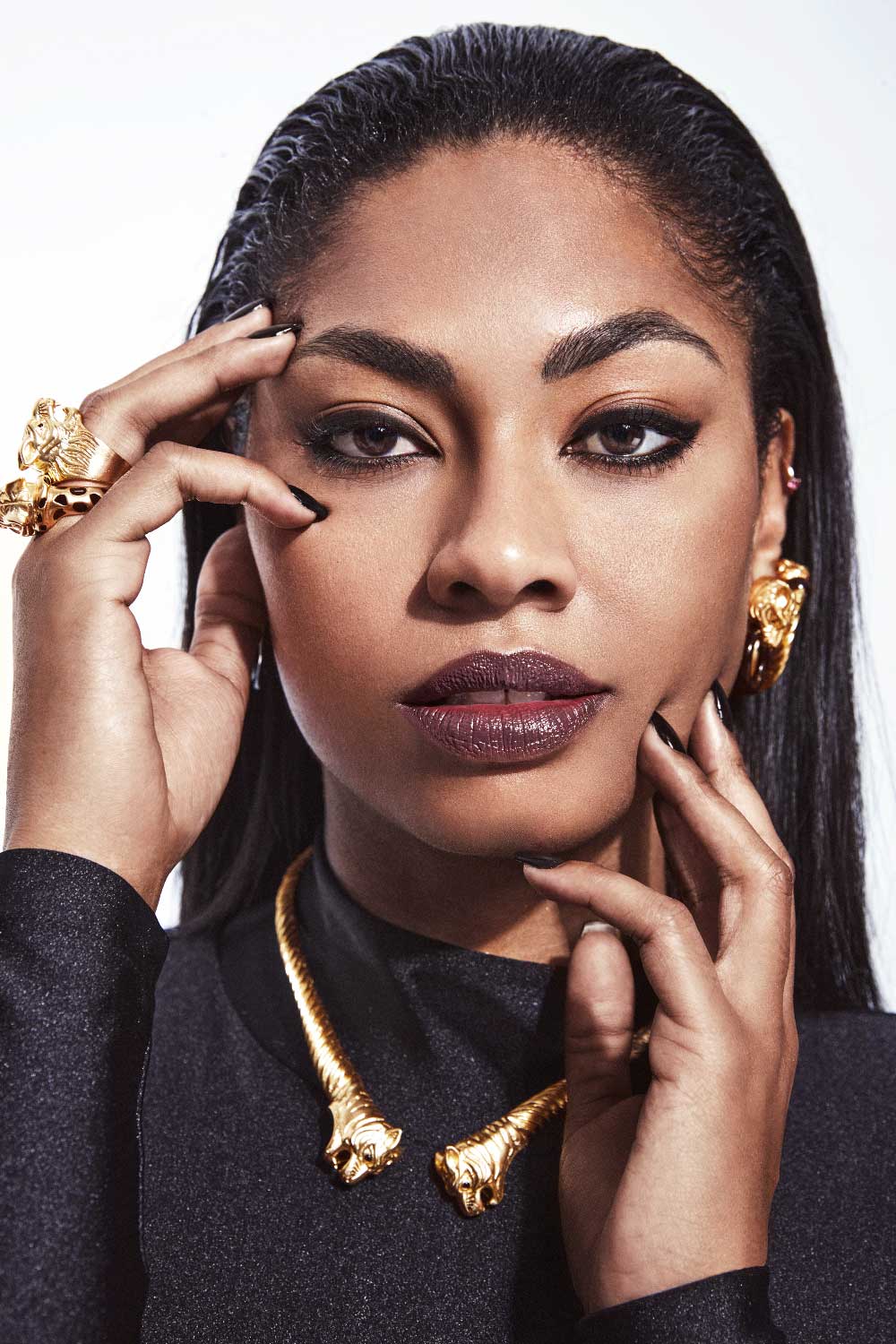 NIA con mono de lycra SAUVAGE MAMMA + Zapato destalonado CHRISTIAN LOUBOUTIN + Brazalete, anillo, collar y pendientes cabeza de leopardo oro TIAHRA + Peluquería con I.C.O.N. PRODUCTS: Mane Control + Airshine