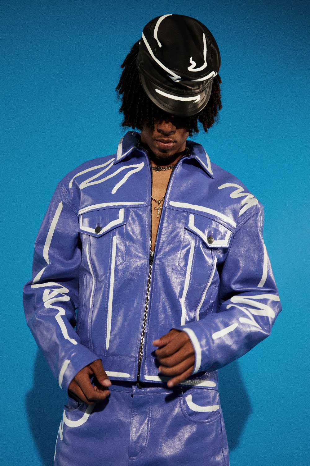 Nickzzy con total look (chaqueta de cuero azul, pantalón y gorra negra de cuero) MOSCHINO + Cadena smiley de plata TWO JEYS + Cadena de oro del cantante