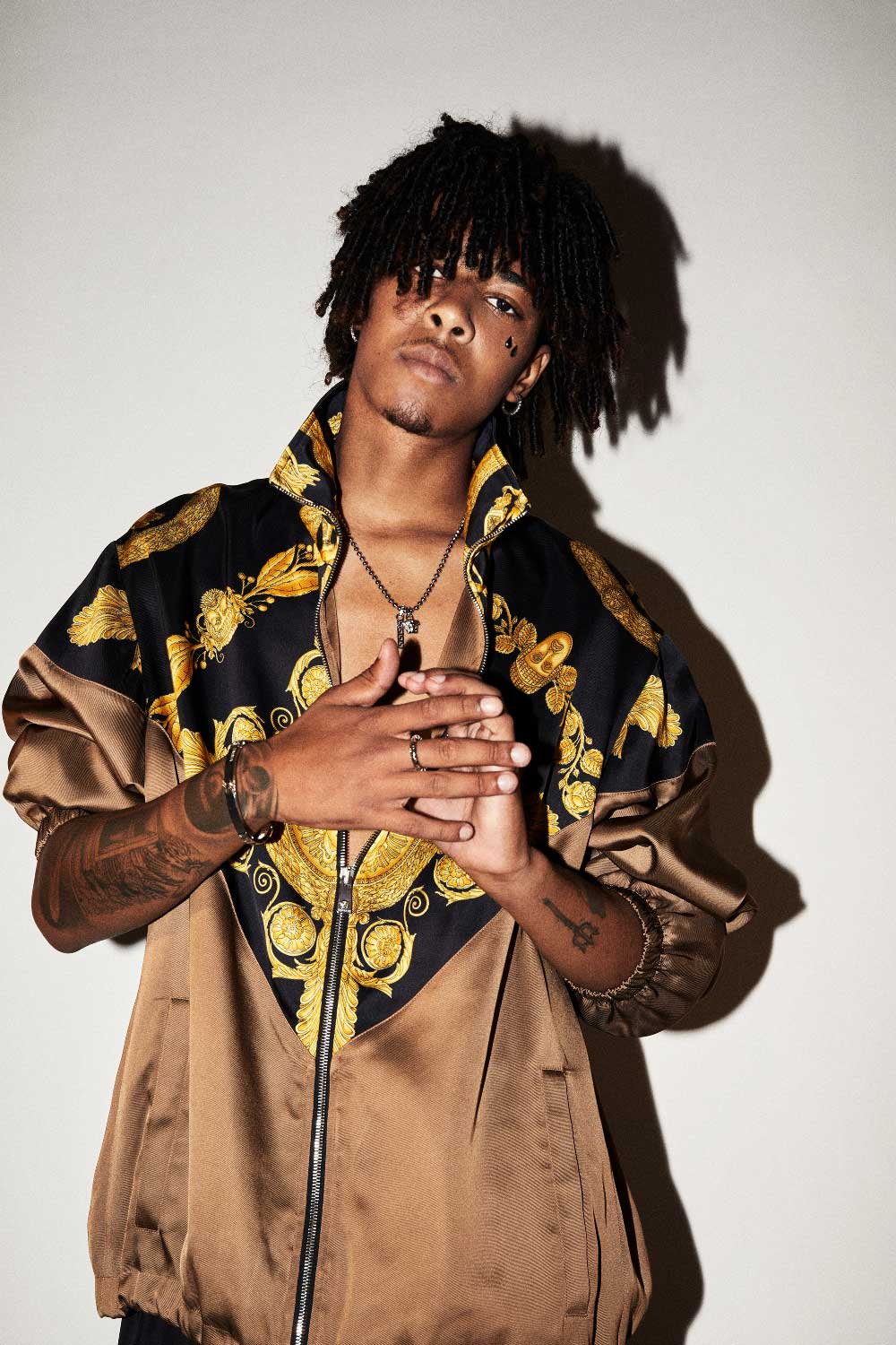 Nickzzy con total look (bomber, pantalones cargo, cadena, pulsera y anillo) VERSACE