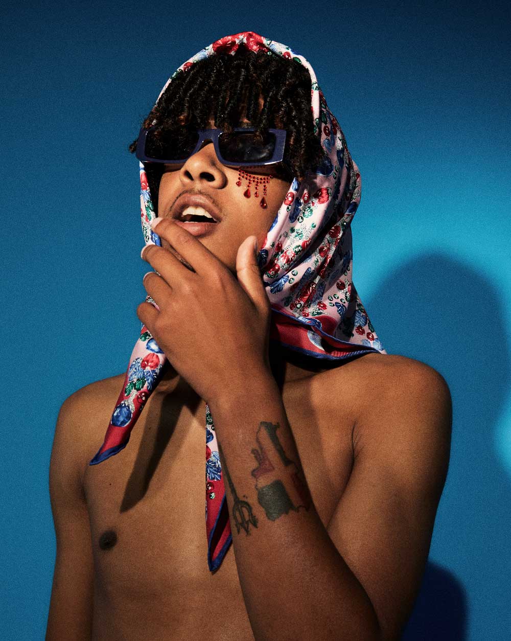 Nickzzy con pañuelo de seda estampado en rosa CARTIER + Gafas de sol TOMMY HILFIGER
