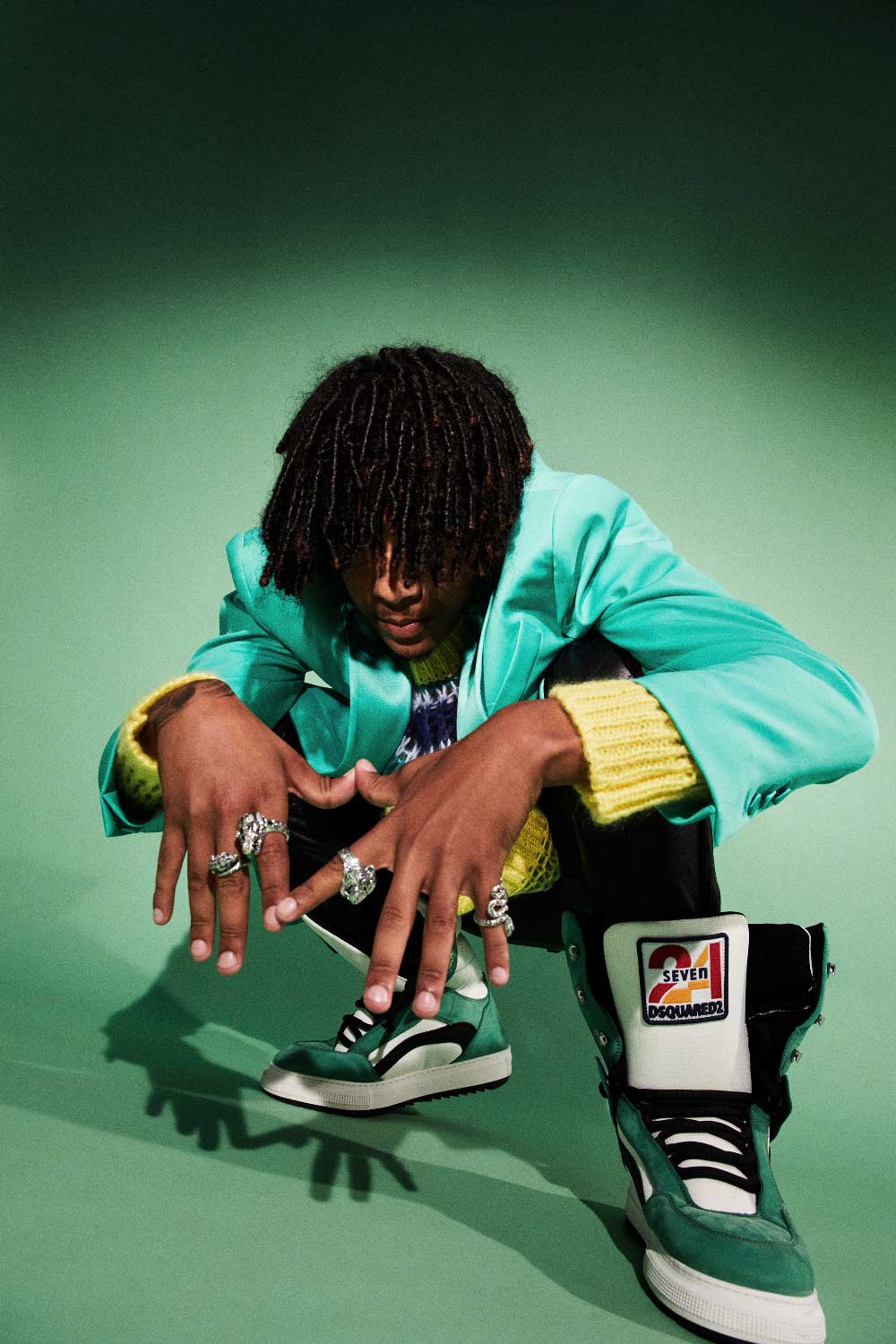 Nickzzy con total look (americana, jersey, pantalones de cuero y zapatillas) DSQUARED2 + Anillos joya con forma de animales THOMAS SABO