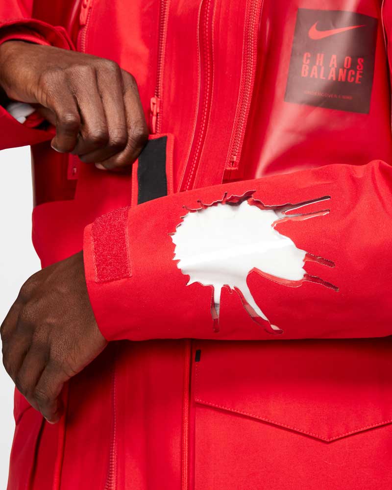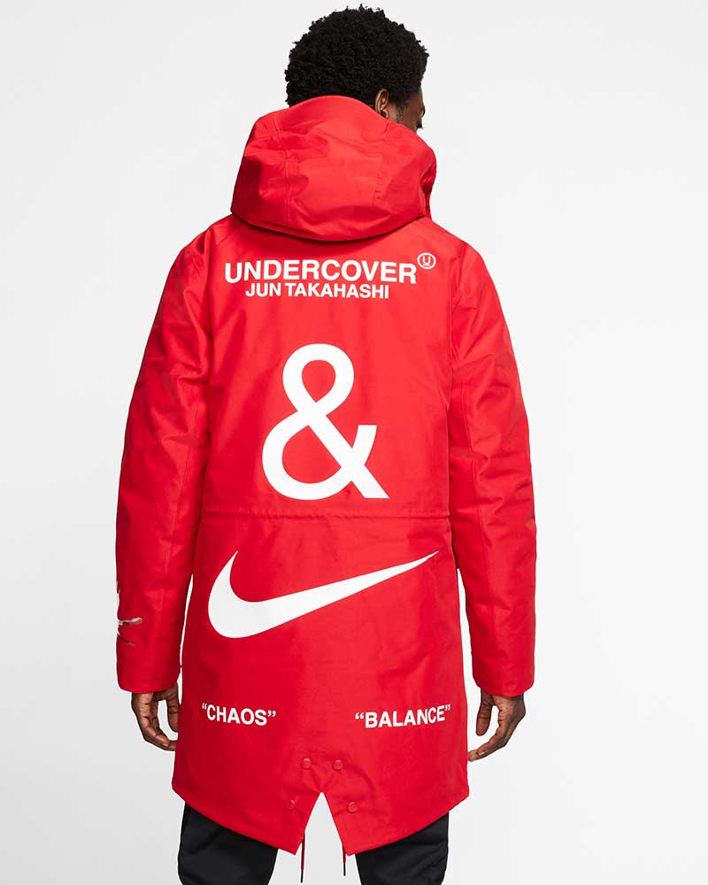 La parka Nike x Undercover Fistail es súper orgullosa y lleva su firma impresa en toda la espalda, en blanco tanto para la versión roja como para la negra. Se puede leer: Undercover Jun Takahashi & Nike Chaos Balance.