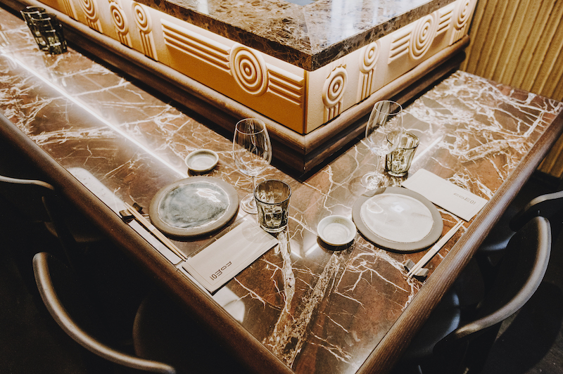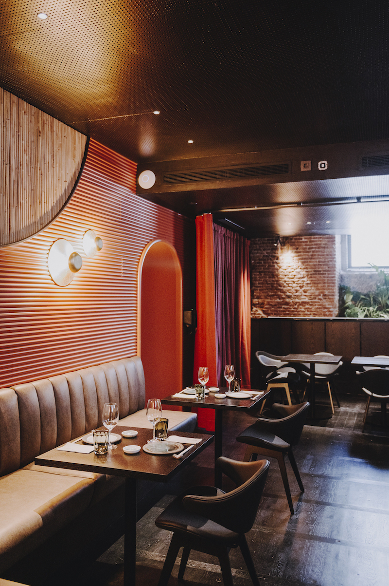 El espacio de Nomo Braganza está dividido en dos plantas. En el piso superior, una espectacular barra de mármol preside la sala y se encarga de dar la bienvenida con sus sushiman. Luego se encuentran las mesas dispuestas en formas orgánicas que envuelven el local y crean diferentes zonas y rincones. Bajando las escaleras, se accede a un espacio íntimo y sutilmente iluminado con mesas y un gran sofá que conviven con un pequeño reservado separado por cortinas donde acoger a grupos. Un proyecto de interiorismo firmado por Cristina Cirera, desde el despacho Cirera + Espinet.