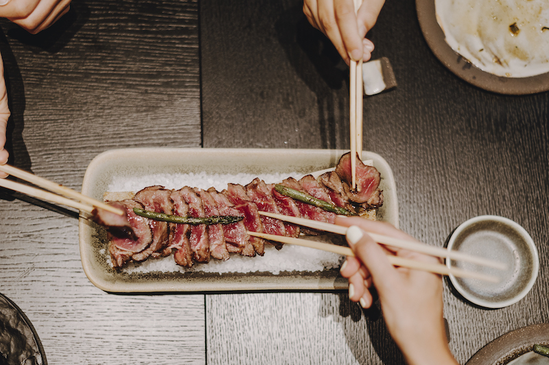 La experiencia puede comenzar con tapas japonesas como Sukiyaki Croquette (croqueta japonesa de rabo de toro rebozado), o Yaki Hotate no Foie (pincho de vieira a la plancha con foie del Empordà, espinacas y salsa teriyaki). En el apartado de entrantes, destacan platos como la sutil Okonomi Omelette (tortilla abierta con pulpo y salsa okonomiyaki) o Ebi Chilli (langostinos picantes sobre base de fideos kataifi crujientes y huevo frito). Entre los éxitos de la barra de sushi, resultan imprescindibles elaboraciones como Salmonete no Tataki (tataki de salmonete con tirabeques al wok, salsa ponzu y hojas de wasabi) o el futomaki Spicy Tuna, además de diferentes propuestas de nigiris y rainbow rolls para los que se emplea el mejor producto con guiños locales como al arroz del Delta del Ebro. Para terminar, algunas creaciones que se preparan en su propio obrador como Crunchy Mochi de Frambuesa con crema de pistacho y cobertura de chocolate blanco, o la cheesecake de té verde con yuzu.