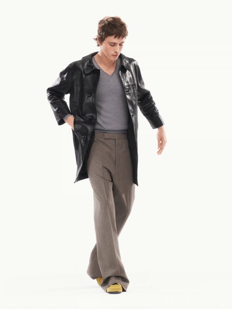 Pero, conceptualismos aparte Prada SS25 es un normcore puro y duro. La clásica camisa de botones hace de base fundamental para los looks de Harris, combinada con pantalones de sastre de corte holgado; e incluso como capa de un look complejo a la vez que minimal. Otro staple de este estilo clásico que sale a relucir es el jersey de cuello de pico, que se combina con una camisa estampada (y un tanto hortera, pero en el buen sentido). Un car coat de cuero negro ayuda a traer ese utilitarismo de Raf a este terreno, junto con un trench arrugado y desestructurado. Y, como accesorios para un look triunfador: bolsos y zapatos de piel con su patina propia.