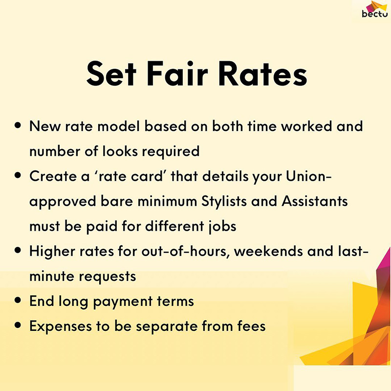 Además, el sindicato de estilistas busca una revisión de no solo las tarifas por hora trabajada. También buscan plazos de pago más razonables y revisión de tarifas en cuanto a horas extra y fines de semana o feriados. El esquema que buscan replicar es el de la BFMAA (la Asociación Británica de Agentes de Modelos de Moda), quienes gozan de parámetros asentados en la industria y contratos estandarizados, por ejemplo.