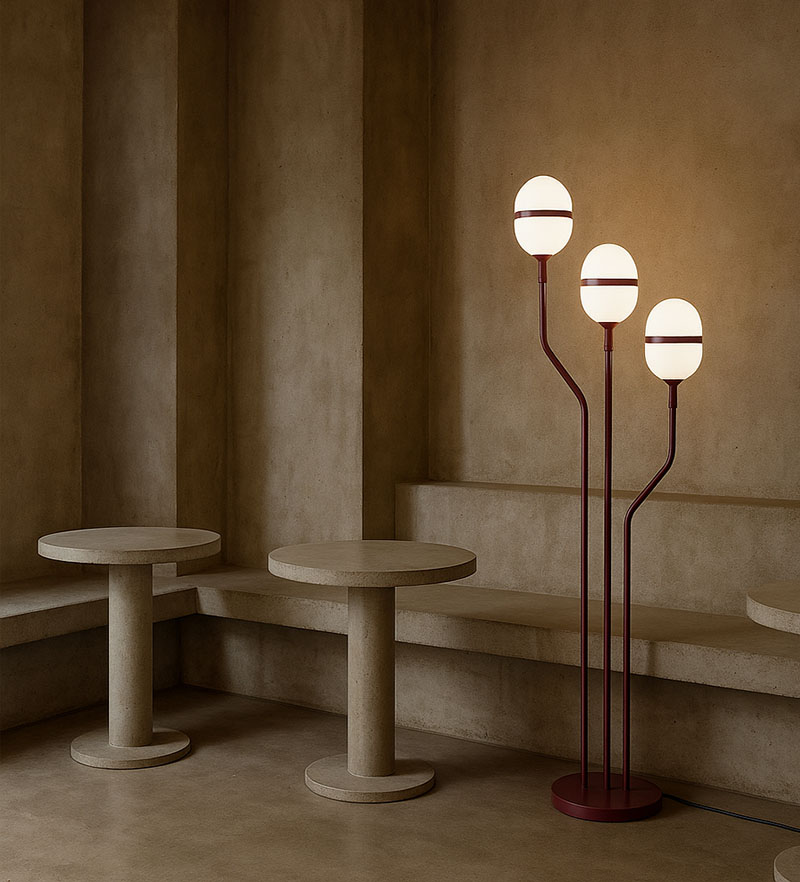 La Yasna es un ramo futurista que decidió echar raíces en tu salón para regalar luz en lugar de flores. Mide 126 cm de alto y se sostiene sobre una base circular de 20 cm de diámetro, tan discreta que parece sostenerla por puro compromiso frente a los tres tallos de metal en rojo vino mate.
