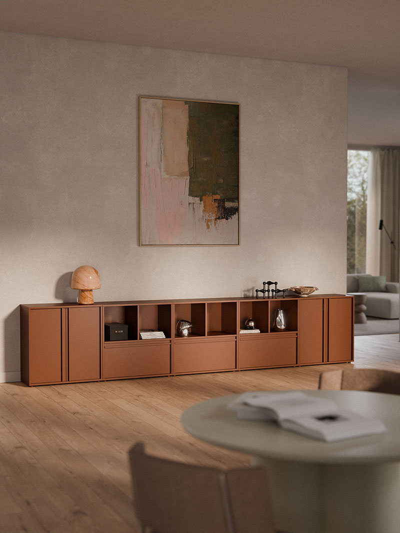 Su acabado terracota lacado les da ese aire cálido que hace que todo muro luzca como recién salido de una revista de interiores. Por dentro, resguardan estantes de 35 × 36 × 34 cm, idóneos para albergar vinilos, cámaras vintage o ese jarrón cuya fragilidad te induce a pedir distancia reverencial.