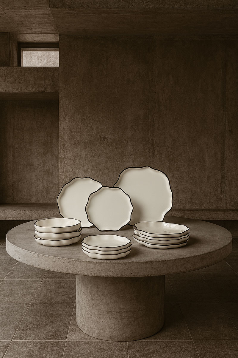 La vajilla Bia tiene el don de embellecer la mesa con sutileza y prestancia. Nos fascinan sus ondulados bordes, realzados por un delicado filo negro, semejantes a pequeñas olas que se estiran y encogen. La colección reúne doce piezas: cuatro llanos de 28 × 3 cm, cuatro hondos de 22 × 4 cm y cuatro de postre de 22 × 3 cm, el séquito perfecto para cuatro comensales que sepan valorar la sofisticación en cualquier ocasión.