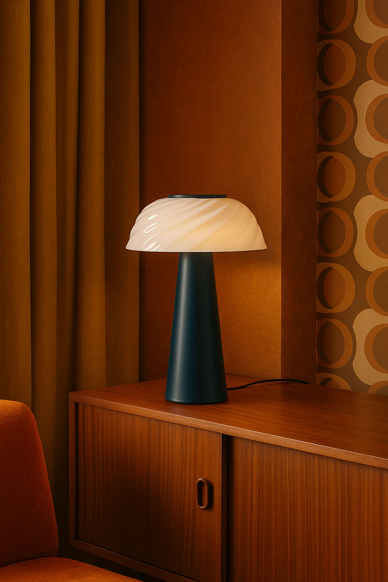 Anya parece haber huido de un estudio de diseño nórdico, pero trae consigo la personalidad suficiente para reinar en cualquier rincón. Su pantalla de vidrio blanco de 27 cm de diámetro, con delicados remolinos, se alza sobre 42 cm de altura total y, aunque aparenta fragilidad, atrae todas las miradas como si midiera el doble.