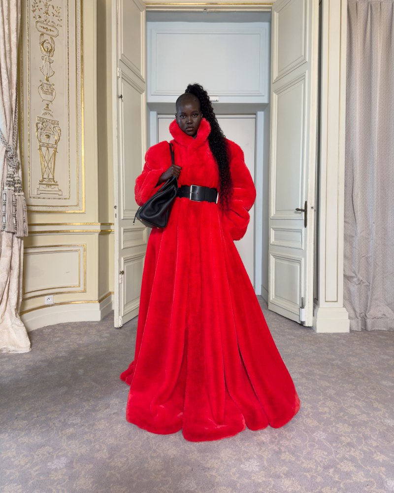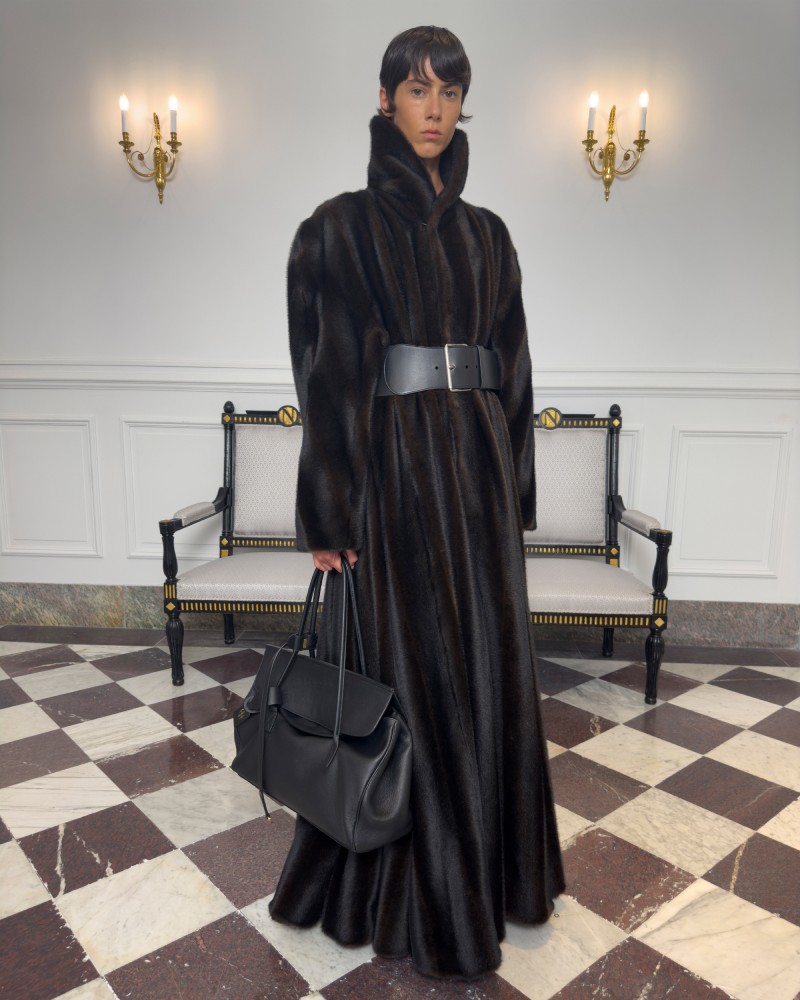 Los looks que se dejan ver en los visuales de Balenciaga Winter 25 hablan muchísimo de la idea de estándares con la que Demna explicó su colección. En el lado femenino, la campaña destaca abrigos de sastre exageradamente proporcionados en contraste con vestidos ultra reveladores en corte y tallaje. El cuero también cobra protagonismo, con abrigos y parkas oversize y cazadoras racer con estructura de corset. Y, como punto street, tenemos abrigos puffer y conjuntos vaqueros en el clásico corte de la maison. Y bueno, tampoco podemos ignorar los abrigos de pelo a lo mob wife.