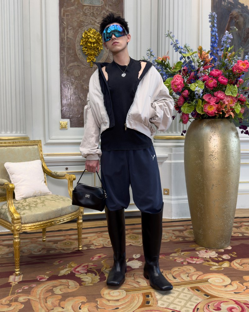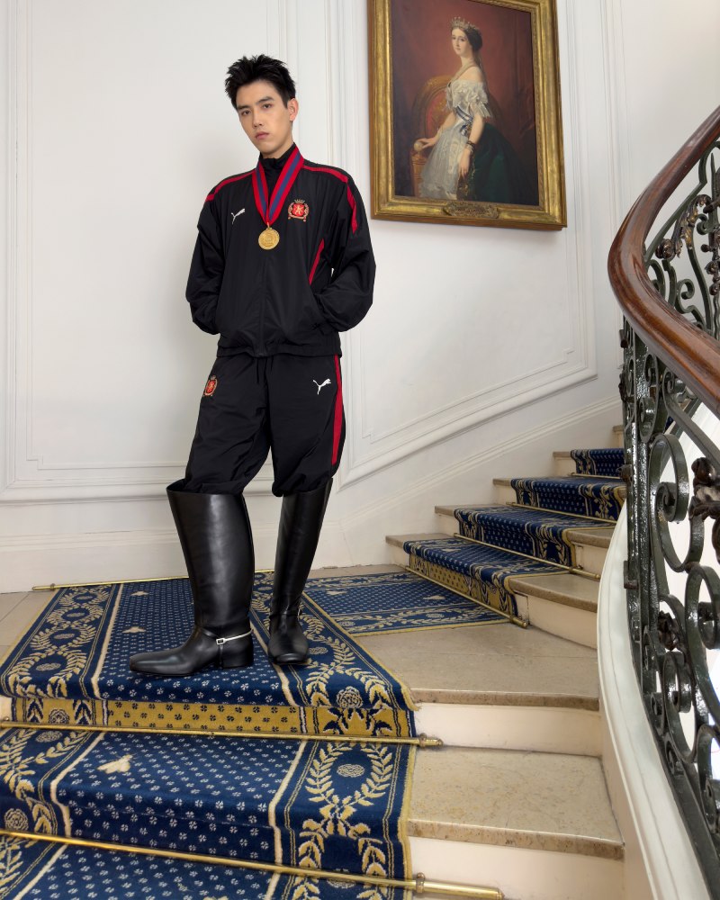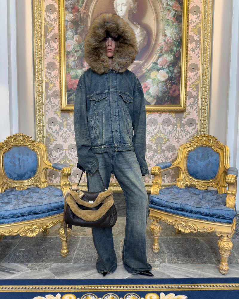 En el lado masculino, los looks de Balenciaga Winter 25 se decantan fuertemente por el nomrcore con trajes y esenciales de menswear en cortes demasiado “estándar”. Como contrapunto urbano, salen a relucir los trajes de chándal de la cápsula colaborativa con Puma y conjuntos denim acentuados con detalles de pelo. Lo interesante: en vez de sneakers en estos looks, los modelitos urbanos se complementan con botas de piel negra.
