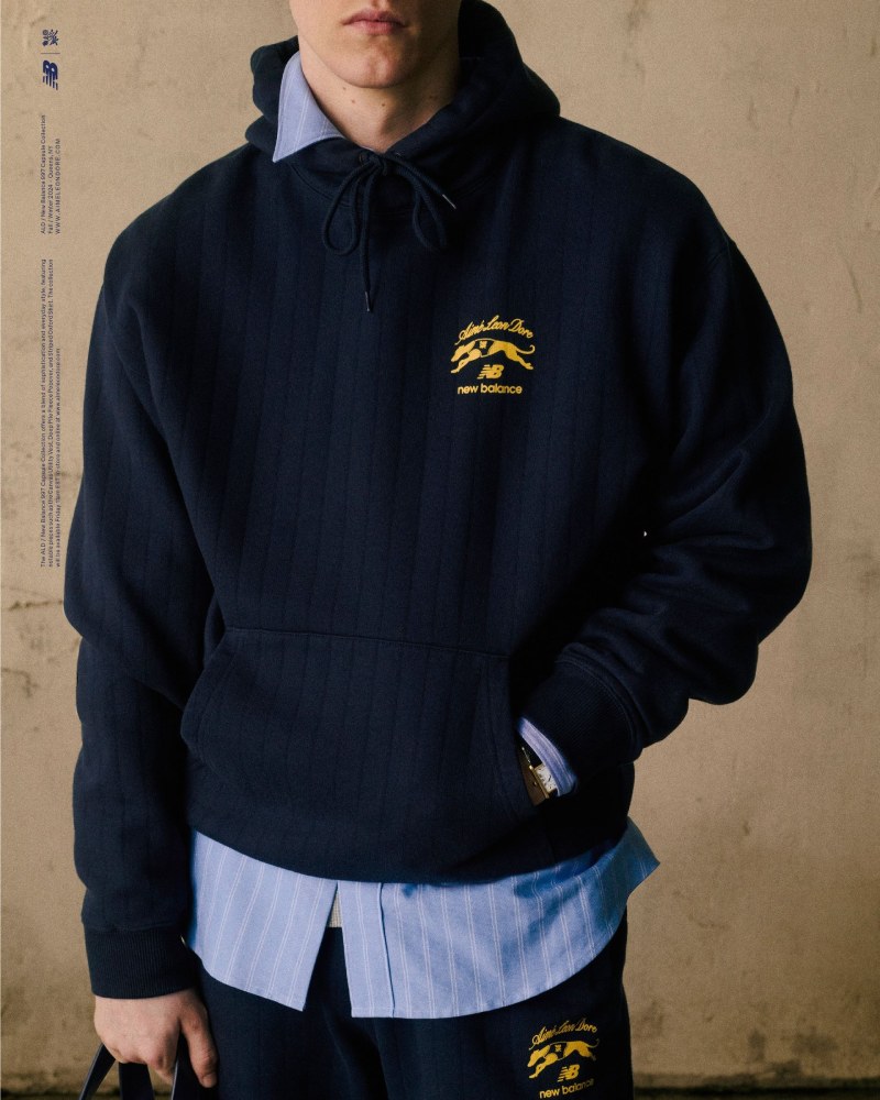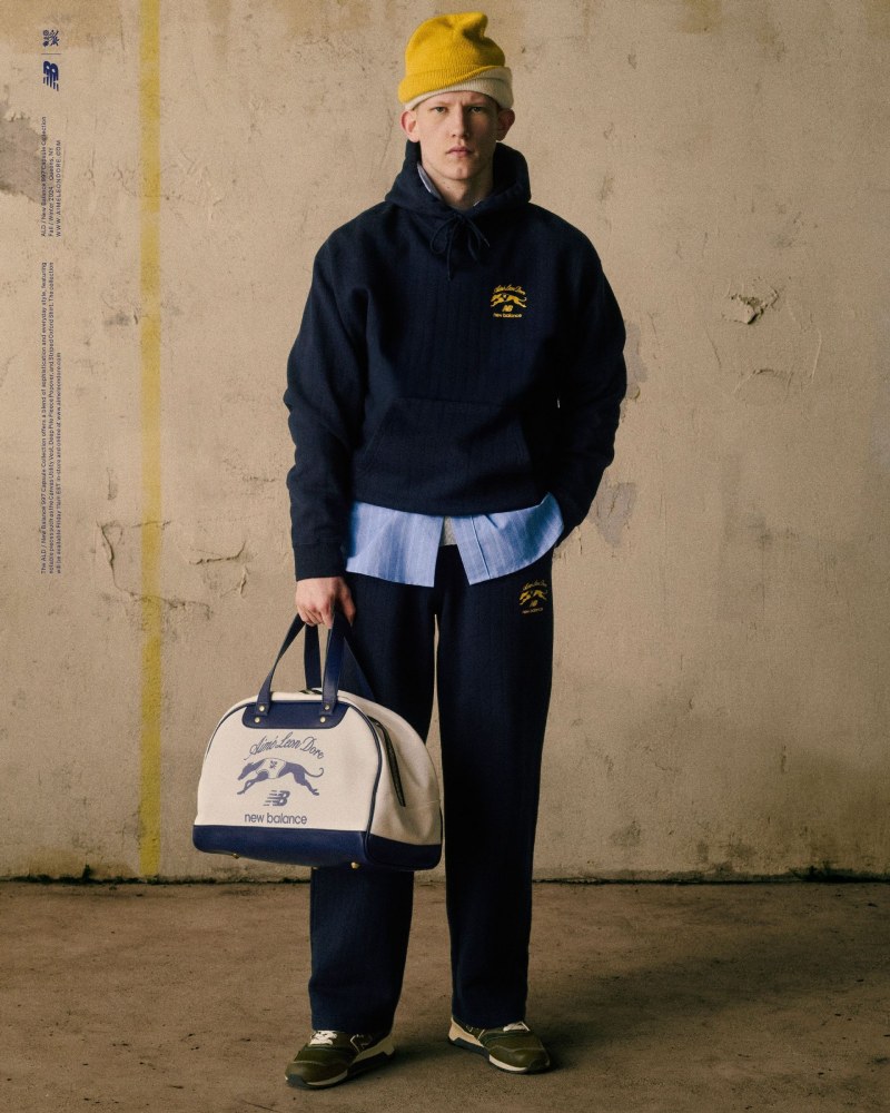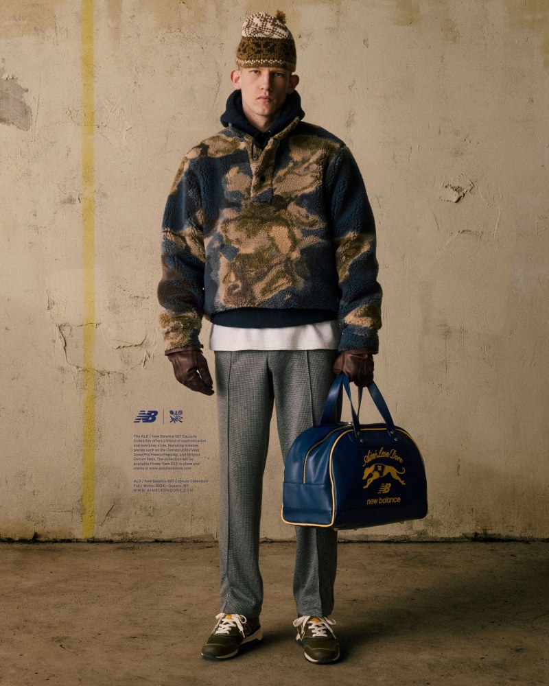 Como capas intermedias, ALD y New Balance reimaginan el chándal típico a través de una construcción mucho más sofisticada. Estos nuevos conjuntos, de corte más slim, se acentúan con costuras acanaladas a lo largo de todas las prendas. Y, debajo, se apuesta por lo clásico con camisas tipo Oxford a rayas. Los looks se completan con gorros tejidos en patrones clásicos e invernales, bolsos de piel tipo bowling, guantes de piel y bufandas de tartán. Y bueno, también con un gorro con orejeras.