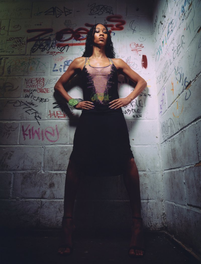 Otra de las grandes influencias estéticas dentro de la cápsula Diesel X Nts es la cartelería de los bolos y el merchan coleccionable de estas actuaciones. Y todo mola bastante. Este armario urbano, Y2k y raver abre con un vestido transparente con estampado de aerógrafo con contornos anatómicos. Como punto de elevación, este esencial se acentúa con un body interno y un print de fechas de gira en el frontal. En esa misma línea, tenemos también una versión roja con cuello mock sin mangas.