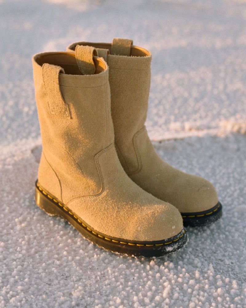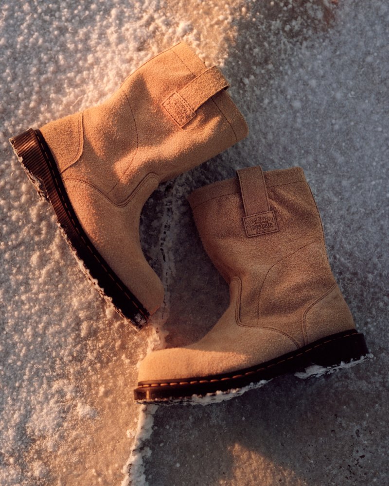 En cuanto a su construcción, las boas de Dr. Martens X Stüssy presentan una silueta de caña alta lograda a través de paneles muy bien definidos. Dentro, al igual que las og, nos encontramos con una puntera redondeada de acero, junto a refuerzos en el talón. Extrañamente, parecen el híbrido entre una Chelsea y una Cowboy. Pasando a los materiales, la estrella de la cápsula es una versión de ante color arena súper clásica y un tanto más elevada. Pero si sois fanáticos del cuero, también tenemos una versión de piel marrón chocolate.