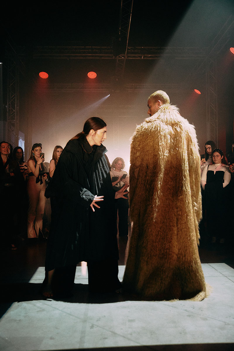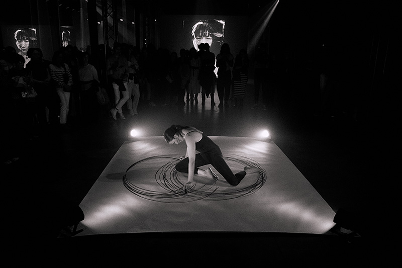 De repente las luces se apagan y a lo lejos, por donde pensabais que iban a pasar modelos, comienza un espectáculo mágico donde diversas artes y artistas se encuentran. Los cubos, a parte de servir como fondo para un juego de proyecciones, se abrían como pequeños escenarios dejando ver las interpretaciones más potentes.