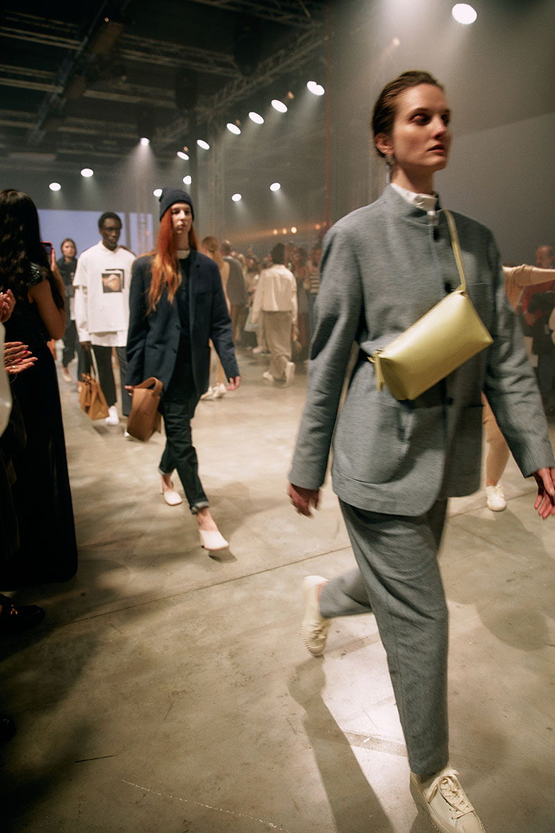 Otro punto a destacar de la nueva colección de Adolfo Domínguez fueron los accesorios. Vimos complementos de verdadero espectáculo acompañando a los looks de Inspira que nos enamoraron. Bolsos en piel de construcción minimalista y propuestas de calzado con líneas limpias fueron piezas tan clave como las mismas prendas.