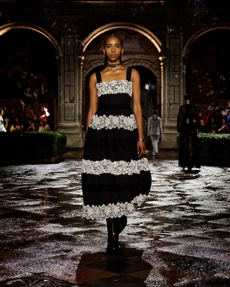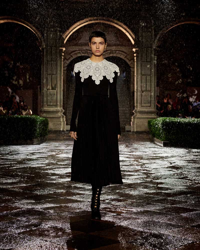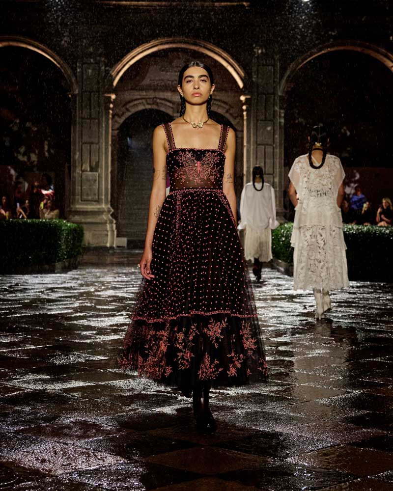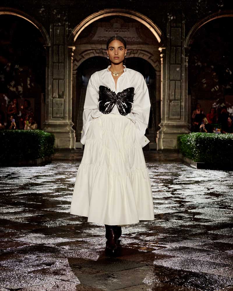 Siendo una colección crucero de Dior, la artesanía del país visitado tenía que jugar un papel protagónico en el discurso. Lo que vimos desfilando por el antiguo colegio de la capital mexicana fue un verdadero espectáculo: delicados bordados y jacquards artesanales decorando faldas y vestidos con motivos de mariposas y polillas acentúan todas las prendas adecuadas de la colección. ¿Por qué mariposas? Pues a parte de ser un guiño más a la obra de Kahlo, las mariposas y polillas que vemos a lo largo de los bordados y la joyería de la nueva colección crucero de Dior hacen como metáfora de la trascendencia que experimentó la propia artista. Así mismo, vemos también una gran proporción de ensambles acabados en un delicado encaje blanco que sirven como contrapunto cromático para esta colección predominantemente negra.