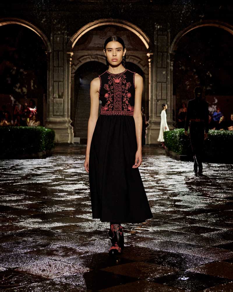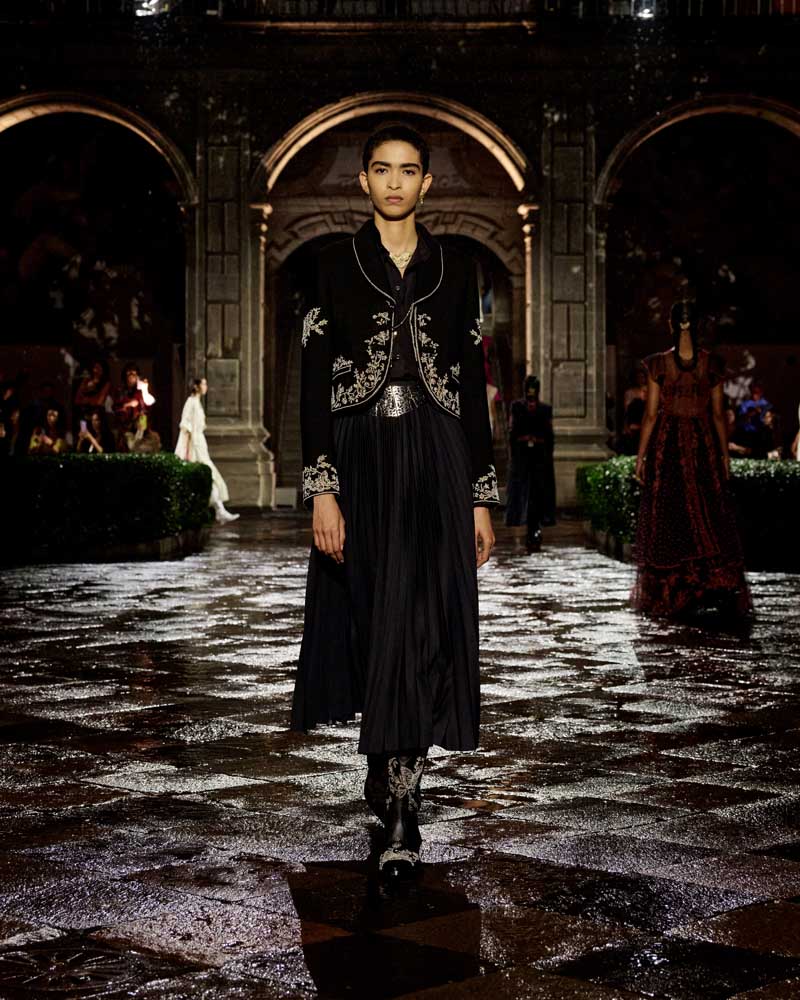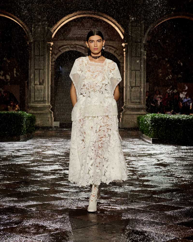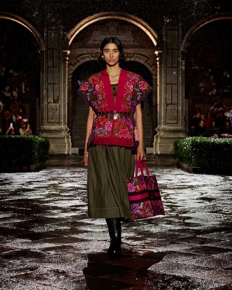 Como tenía que ser, la indumentaria y vestuario tradicional de la cultura mexicana ha estado muy presente en la colección Dior Cruise 2024. Desde los arquetipos clásicos de la maison hasta reproducciones/ reinterpretaciones de trajes tradicionales , el legado cultural e y artesano del país brilló por todo lo alto. Encabezando esta sección vemos una procesión de trajes de tehuana, fieles a la tradición zapoteca. De igual manera, faldas largas se complementan con túnicas tradicionales (huipiles) y vemos conjuntos adornados con ponchos y demás arquetipos tradicionales.