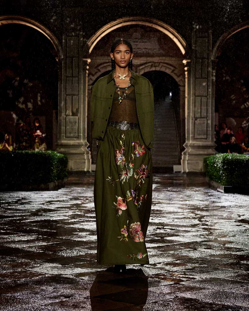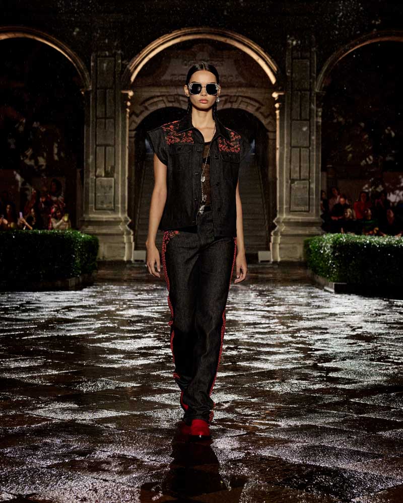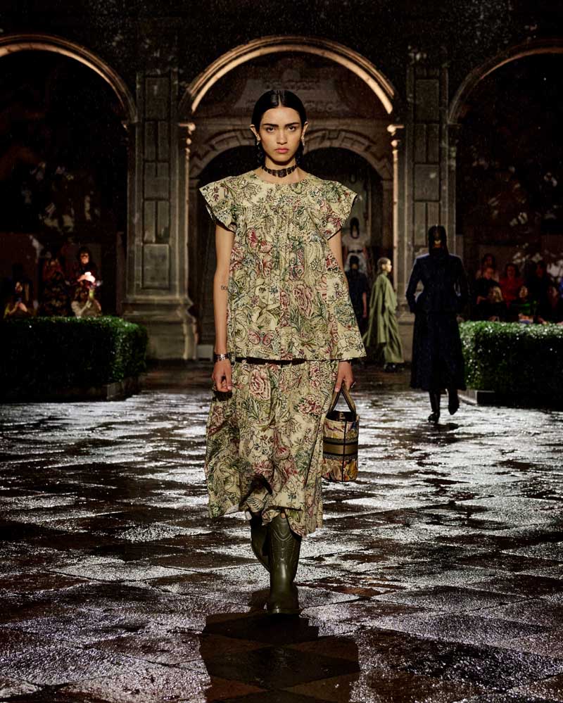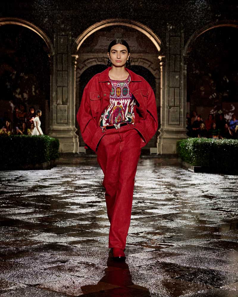 Como tenía que ser, la indumentaria y vestuario tradicional de la cultura mexicana ha estado muy presente en la colección Dior Cruise 2024. Desde los arquetipos clásicos de la maison hasta reproducciones/ reinterpretaciones de trajes tradicionales , el legado cultural e y artesano del país brilló por todo lo alto. Encabezando esta sección vemos una procesión de trajes de tehuana, fieles a la tradición zapoteca. De igual manera, faldas largas se complementan con túnicas tradicionales (huipiles) y vemos conjuntos adornados con ponchos y demás arquetipos tradicionales.