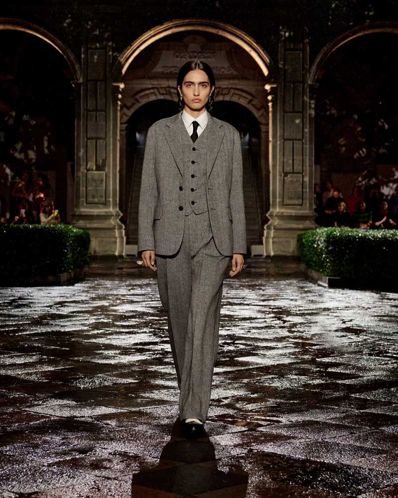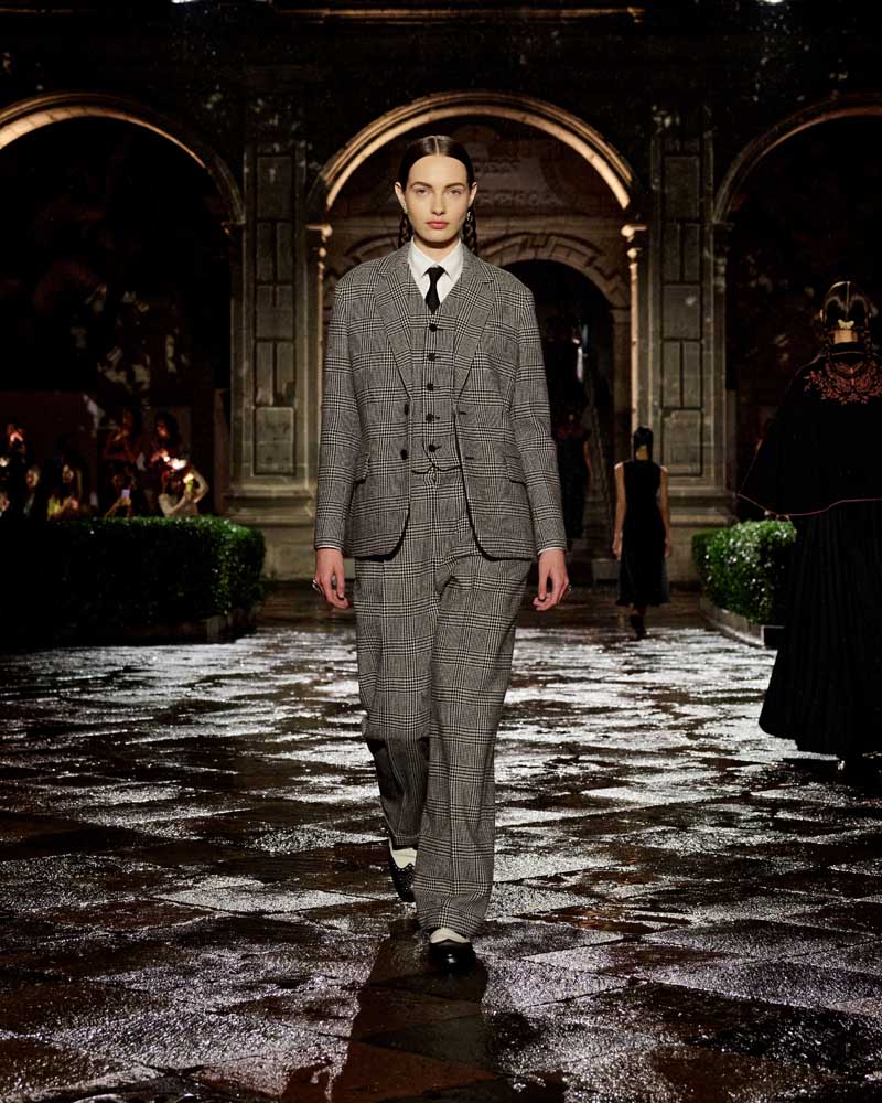 A parte de su obra pictórica, Frida Kahlo era también famosa por desafiar los cánones y construcciones de género en el México del siglo XX. Esto desde tan solo los 19 años, cuando comenzó a llevar trajes masculinos de tres piezas; ahora estos trajes sirven como inspiración para la propuesta de sastrería femenina de Dior en Cruise 2024. La oferta de trajes para mujer comienza con dos conjuntos, de tres piezas a lo Frida, de corte antiguo con sutiles claves de modernidad presentados en print de Príncipe de Gales y en lana gris Dior; la camisa blanca y corbata negra slim rematan ambos looks.