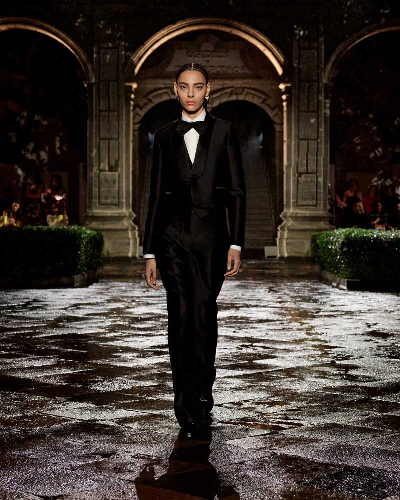 La nueva colección crucero de Dior también presenta opciones de sastrería para la noche: conjuntos de esmoquin. Algunos de corte ultra clásico, como el negro y el marfil al final del desfile; otros juegan más con la vanguardia incorporando faldas tradicionales y tejidos más especiales… como el terciopelo. A estos conjuntos se les cierra con broche de oro con pajaritas de gran tamaño, como punto que une el pasado con el futuro.