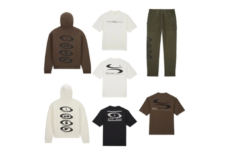 ¿Qué podemos encontrar en el nuevo armario de Air Jordan X Travis Scott? Pues sudaderas (tanto pullover como de cremallera), camisetas y joggers con bolsillos cargo. Como toque de Y2K todas estas prendas se decoran con branding nostálgico que combinan iconografía clásica de Nike y Jordan con diseños circulares y dinámicos. También, vemos en algunas piezas las inscripciones Air Jack y “Quality Inspired By The Greatest Player Ever”.