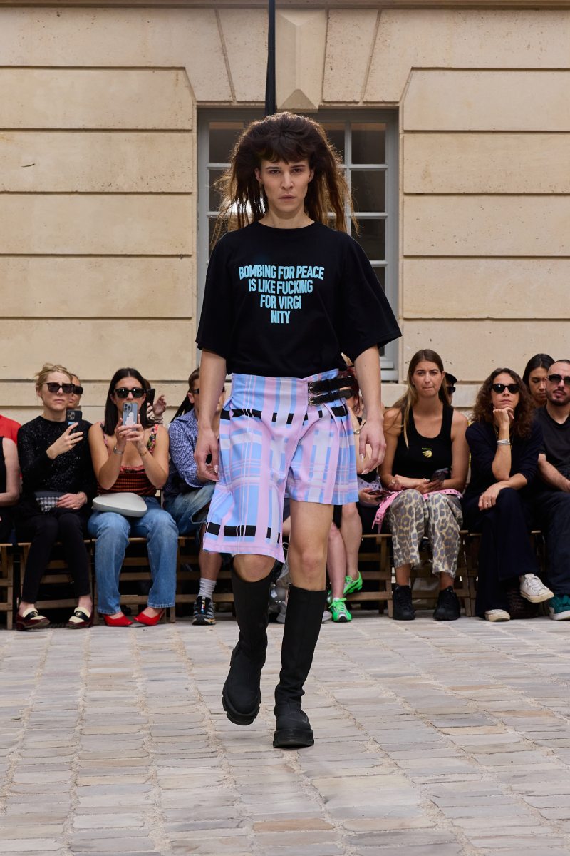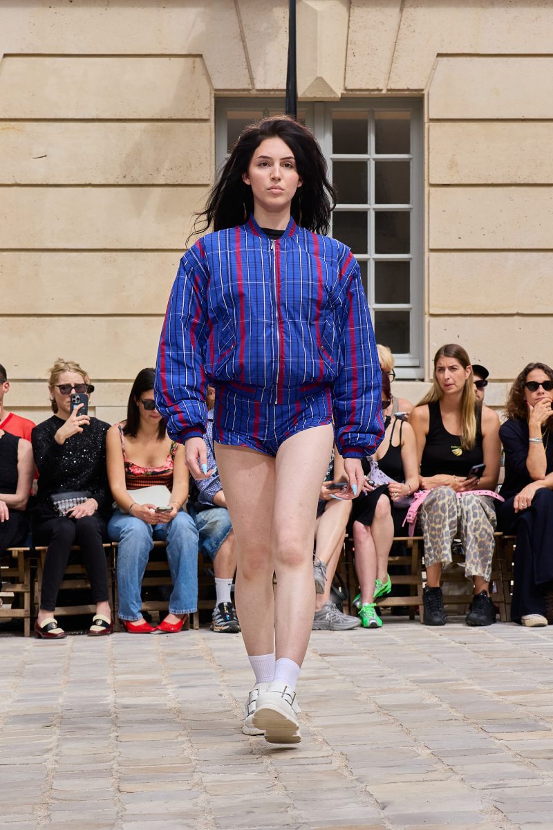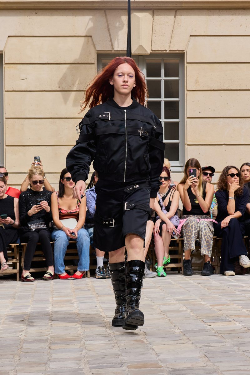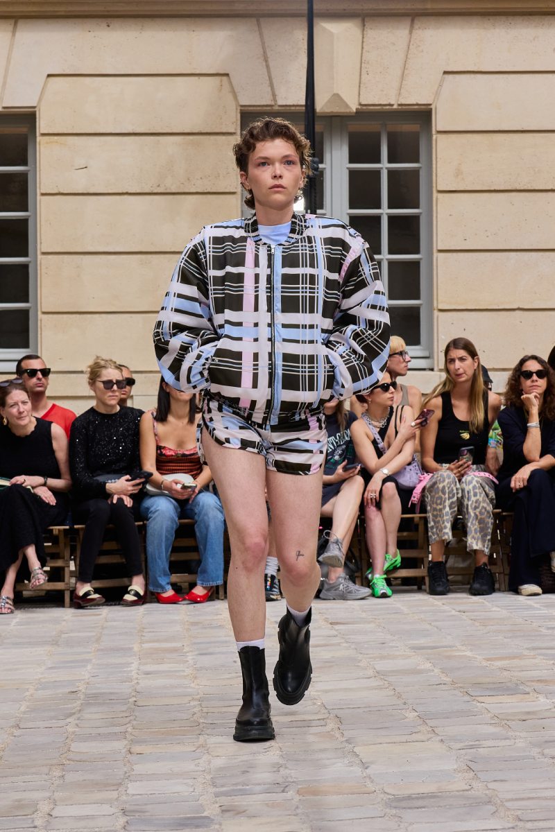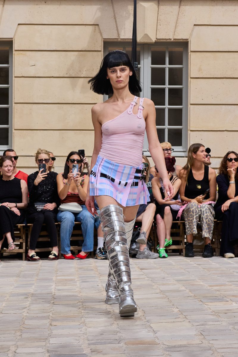 En cuanto a la ropa per sé, Jeanne Friot ss26 abre con sus looks más de vestir. Aquí, vemos sastrería oversize y estructurada acentuada con correas a lo bdsm; y también se incluyen bermudas de pinzas en estos looks. Así mismo, salen a relucir vestidos minimalistas coronados por las mismas correas que sus homólogos sartoriales. Las cazadoras bomber con straps también son uno de los puntos clave de la colección igualmente se muestran muy oversize en colores neutros o como piezas statement gracias a un nuevo print de tartán de la firma (¿referencia a Vivienne? Puede ser). El print sigue permeando el armario street a través de tops ceñidos, vestidos, shorts cortísimos… es el punto más visual de este armario.