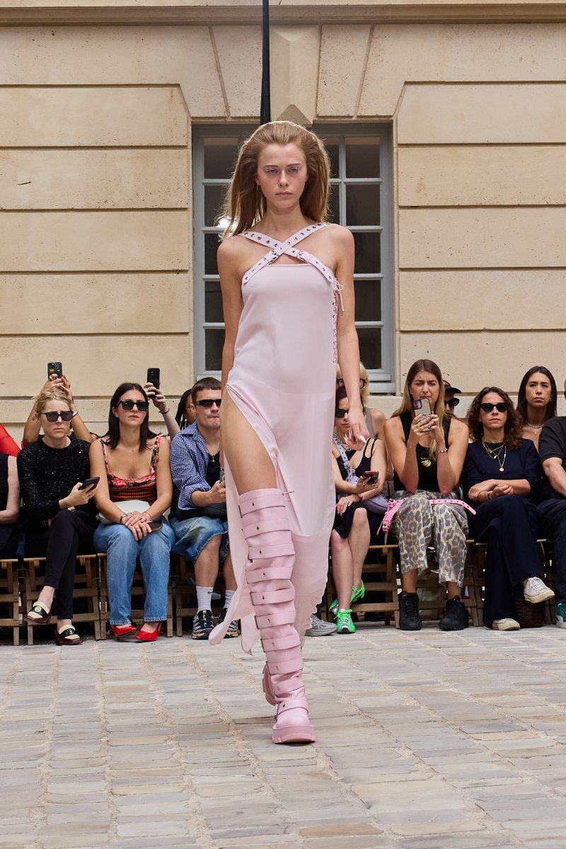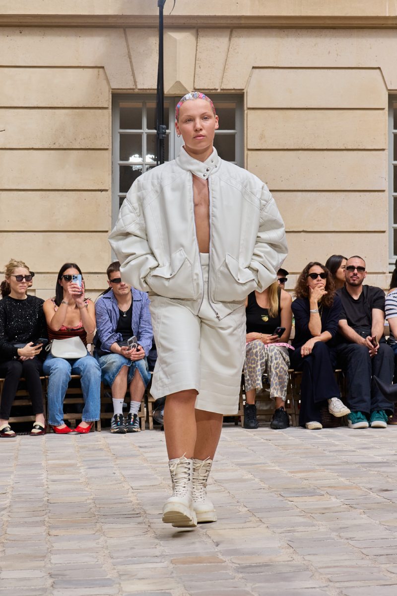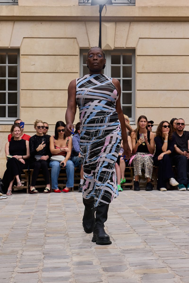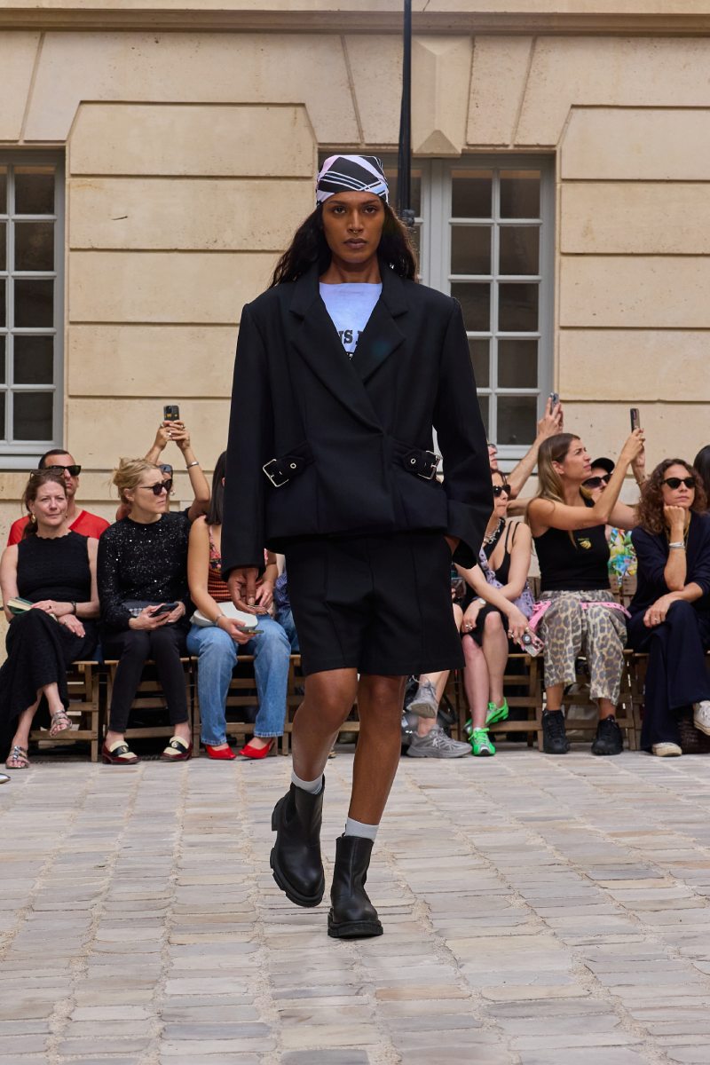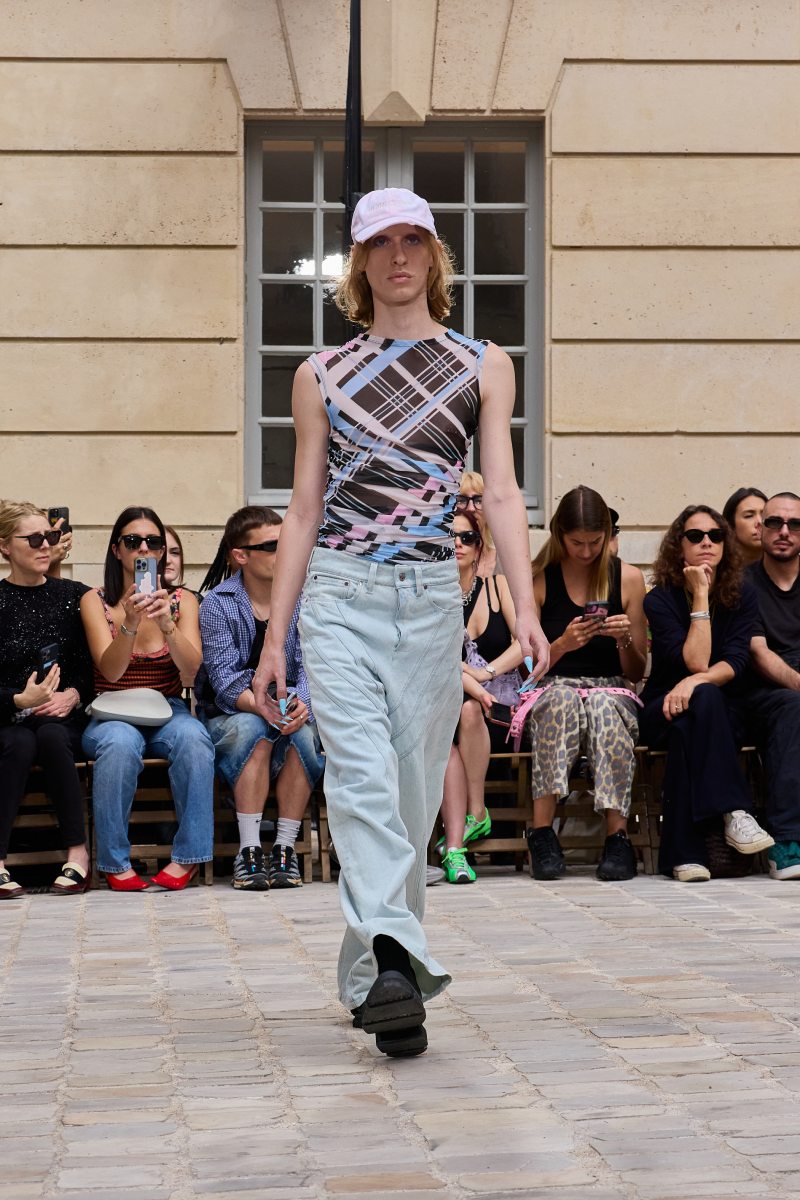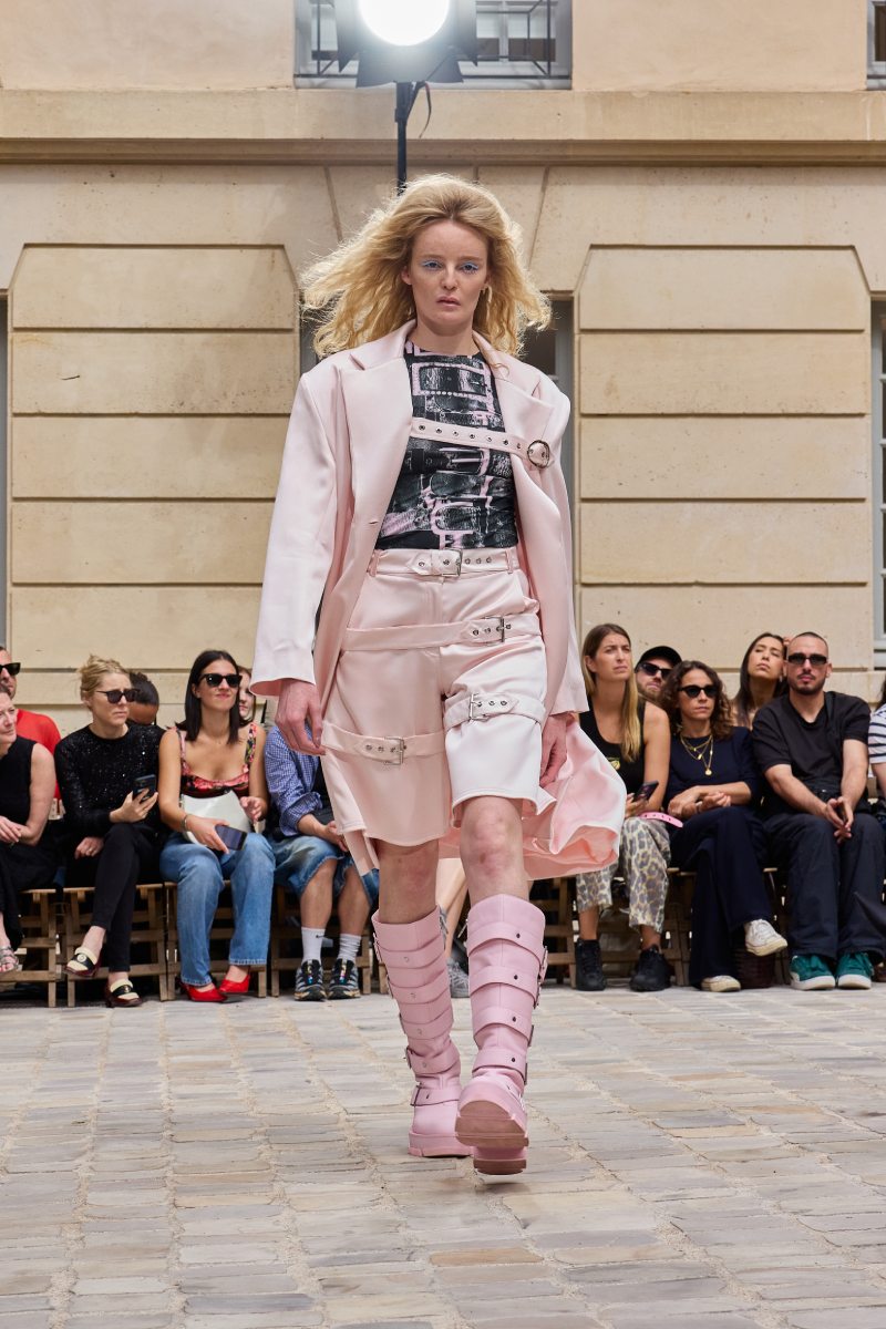 En cuanto a la ropa per sé, Jeanne Friot ss26 abre con sus looks más de vestir. Aquí, vemos sastrería oversize y estructurada acentuada con correas a lo bdsm; y también se incluyen bermudas de pinzas en estos looks. Así mismo, salen a relucir vestidos minimalistas coronados por las mismas correas que sus homólogos sartoriales. Las cazadoras bomber con straps también son uno de los puntos clave de la colección igualmente se muestran muy oversize en colores neutros o como piezas statement gracias a un nuevo print de tartán de la firma (¿referencia a Vivienne? Puede ser). El print sigue permeando el armario street a través de tops ceñidos, vestidos, shorts cortísimos… es el punto más visual de este armario.