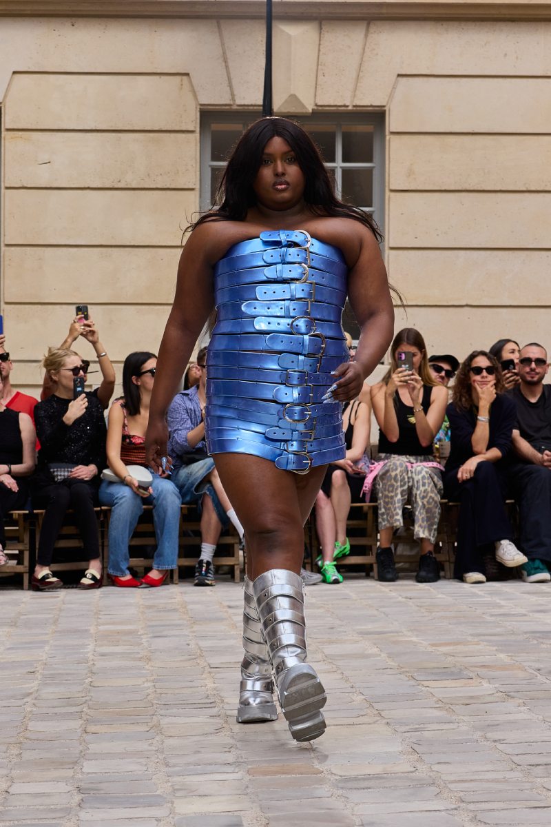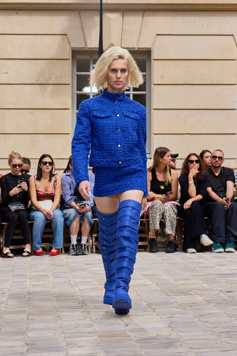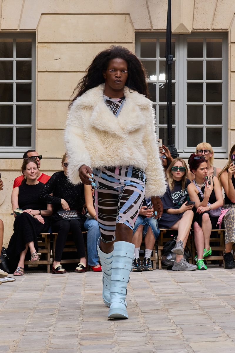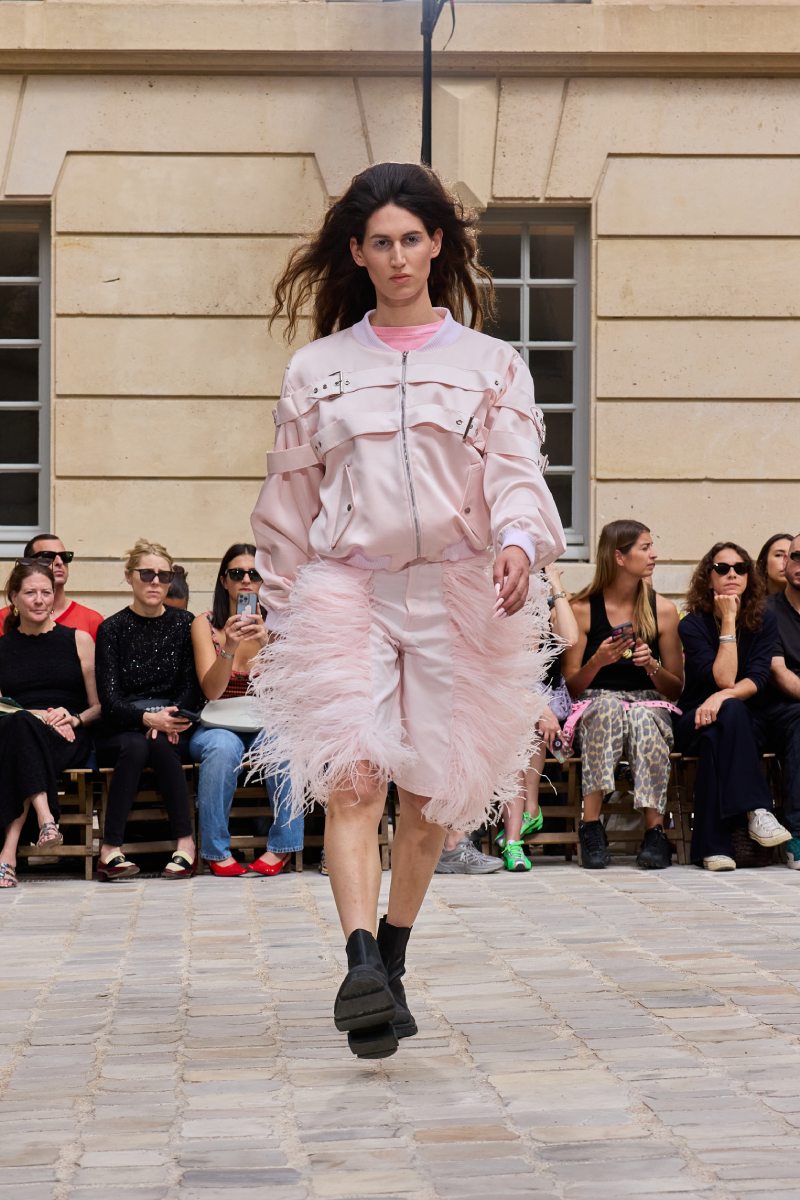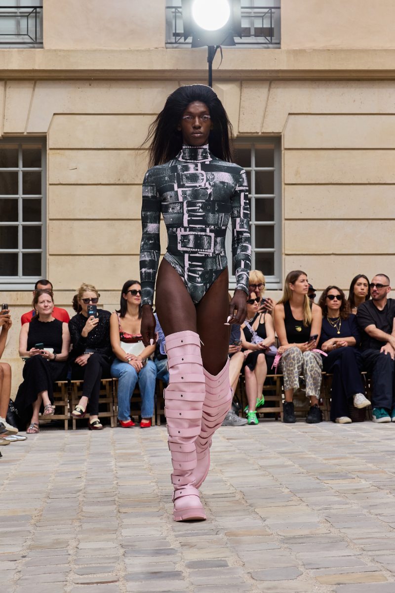 En cuanto a la ropa per sé, Jeanne Friot ss26 abre con sus looks más de vestir. Aquí, vemos sastrería oversize y estructurada acentuada con correas a lo bdsm; y también se incluyen bermudas de pinzas en estos looks. Así mismo, salen a relucir vestidos minimalistas coronados por las mismas correas que sus homólogos sartoriales. Las cazadoras bomber con straps también son uno de los puntos clave de la colección igualmente se muestran muy oversize en colores neutros o como piezas statement gracias a un nuevo print de tartán de la firma (¿referencia a Vivienne? Puede ser). El print sigue permeando el armario street a través de tops ceñidos, vestidos, shorts cortísimos… es el punto más visual de este armario.