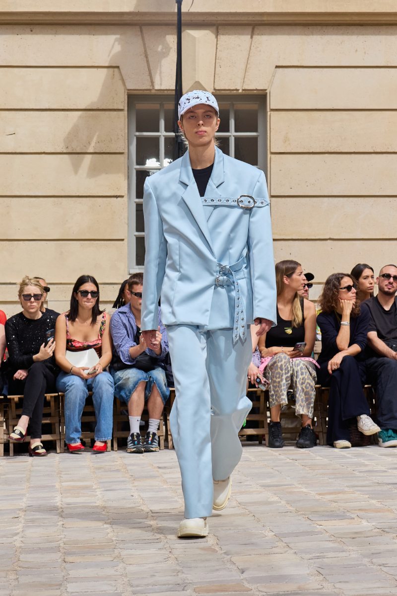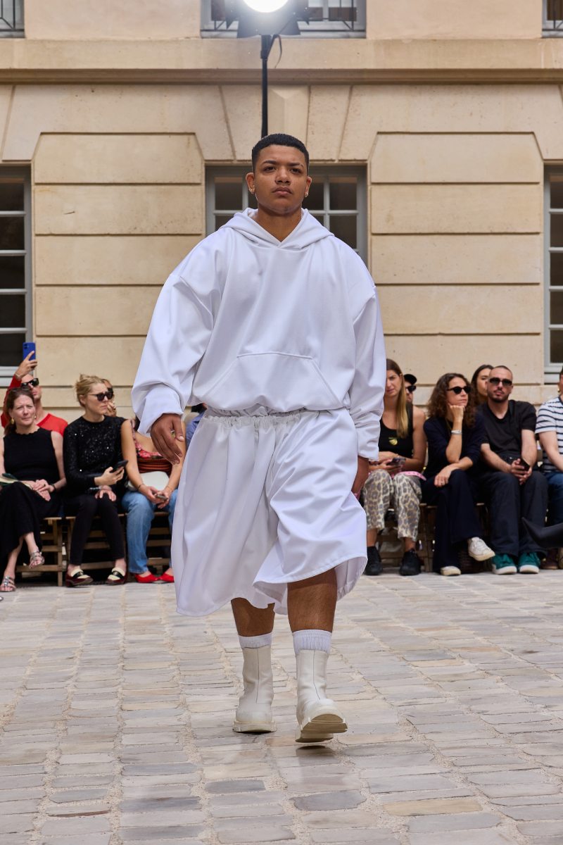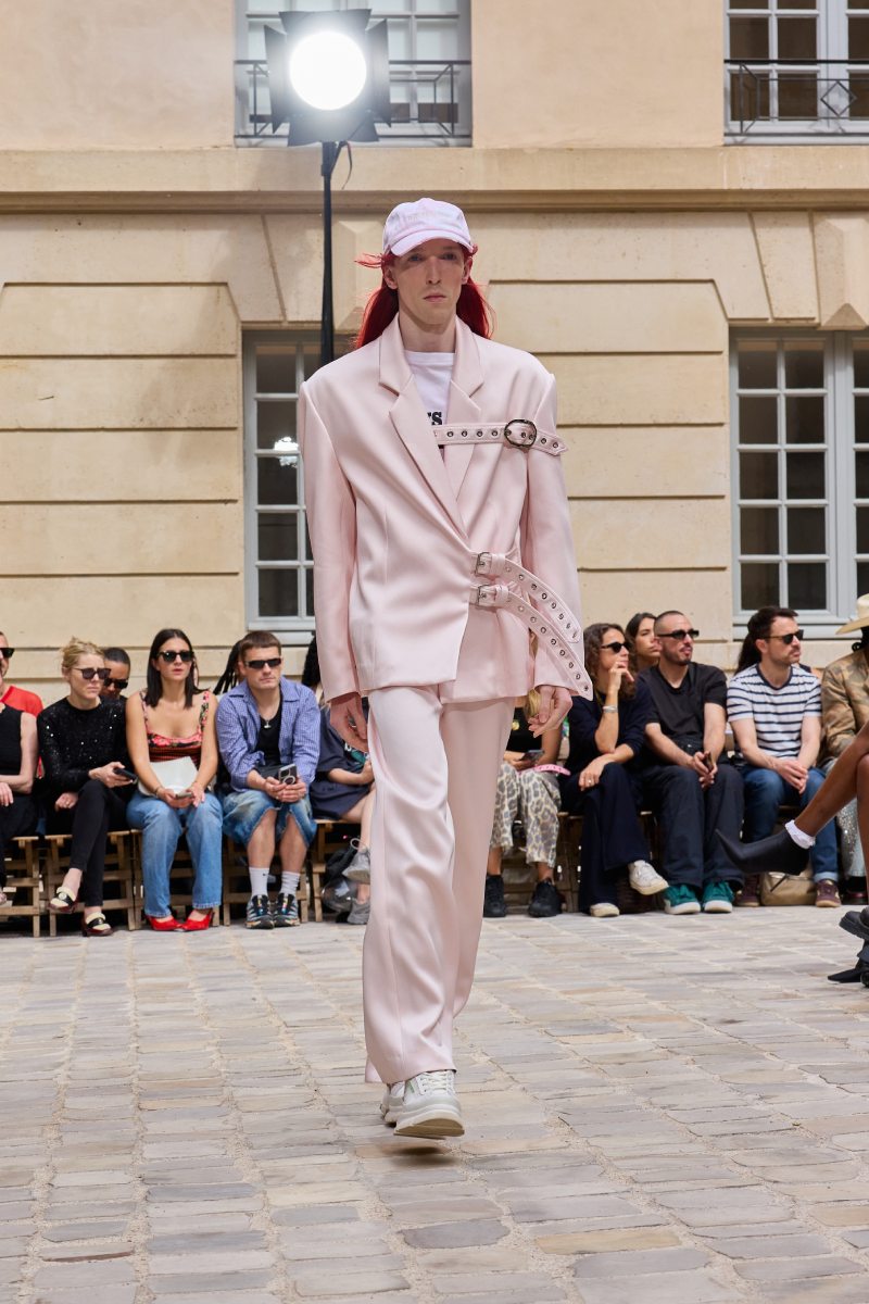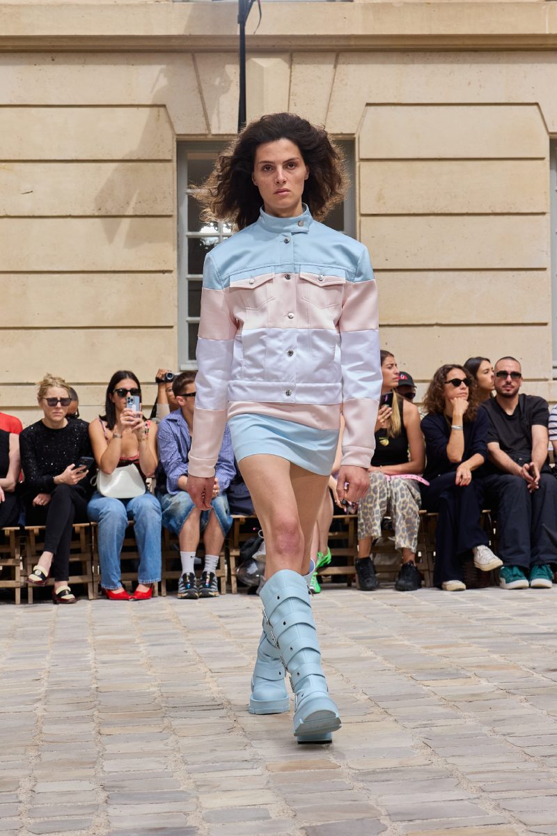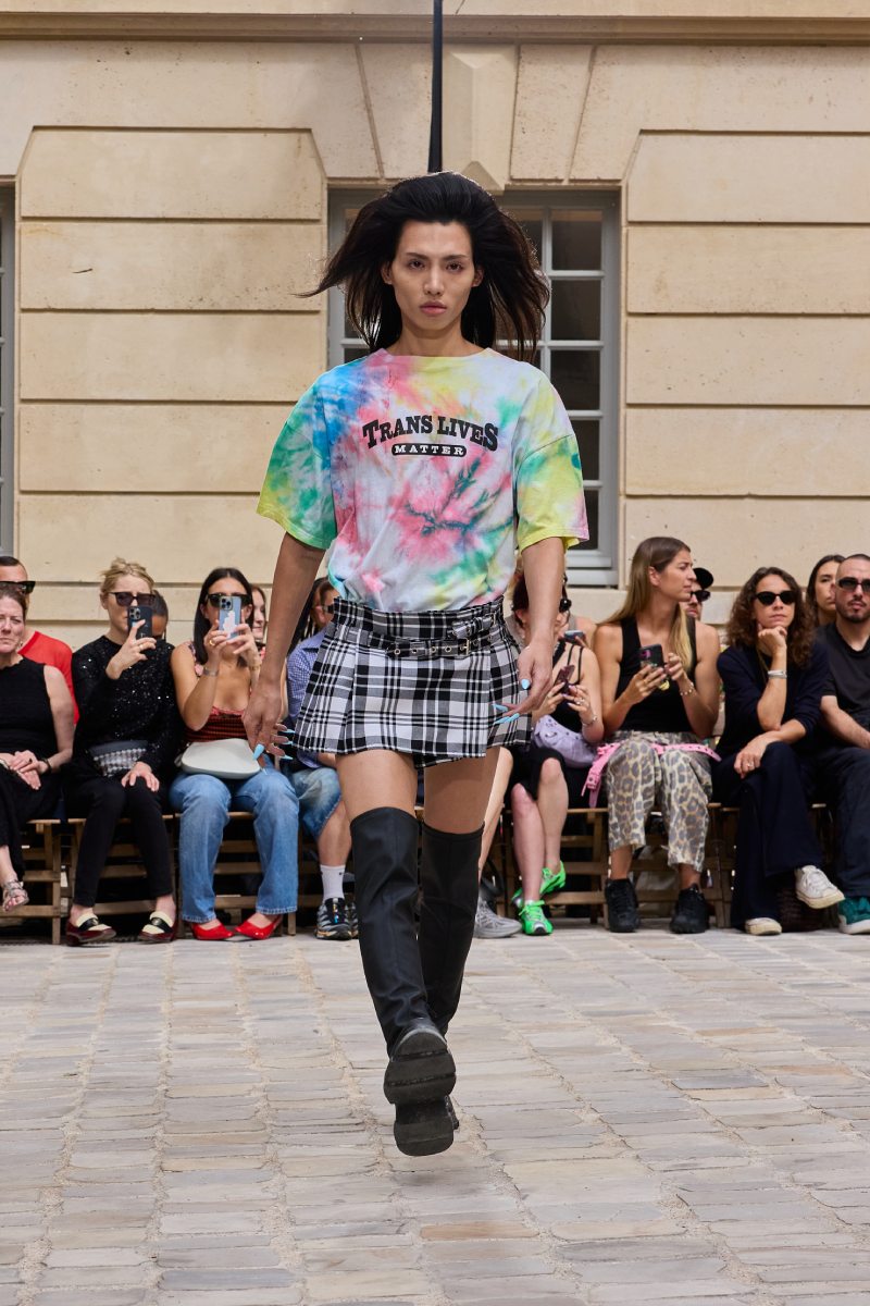 El armario de Jeanne Friot ss26 se llama Resistance, y es una declaración de intenciones en toda regla que no deja -nada- a la imaginación. Siguiendo el theme de inclusión trans de antiguas colecciones, la diseñadora toma una posición mucho más literal; vista a través de la paleta de colores, que utiliza la bandera del orgullo de este colectivo. Y, como base, salen a relucir los staples urbanos que definen su identidad y exploran las posibilidades de un armario genderless.