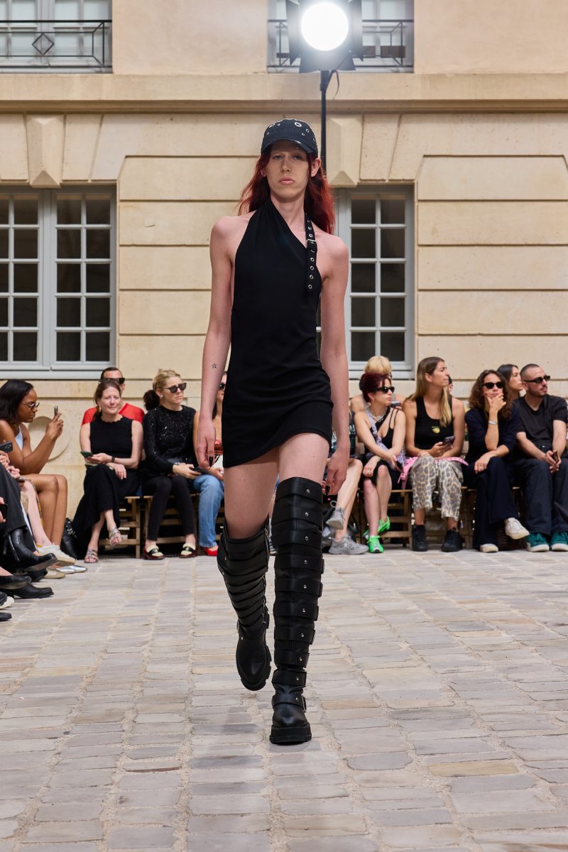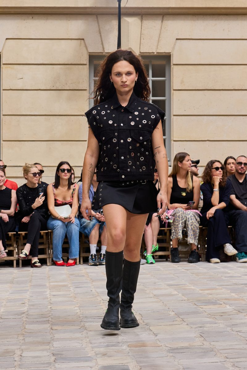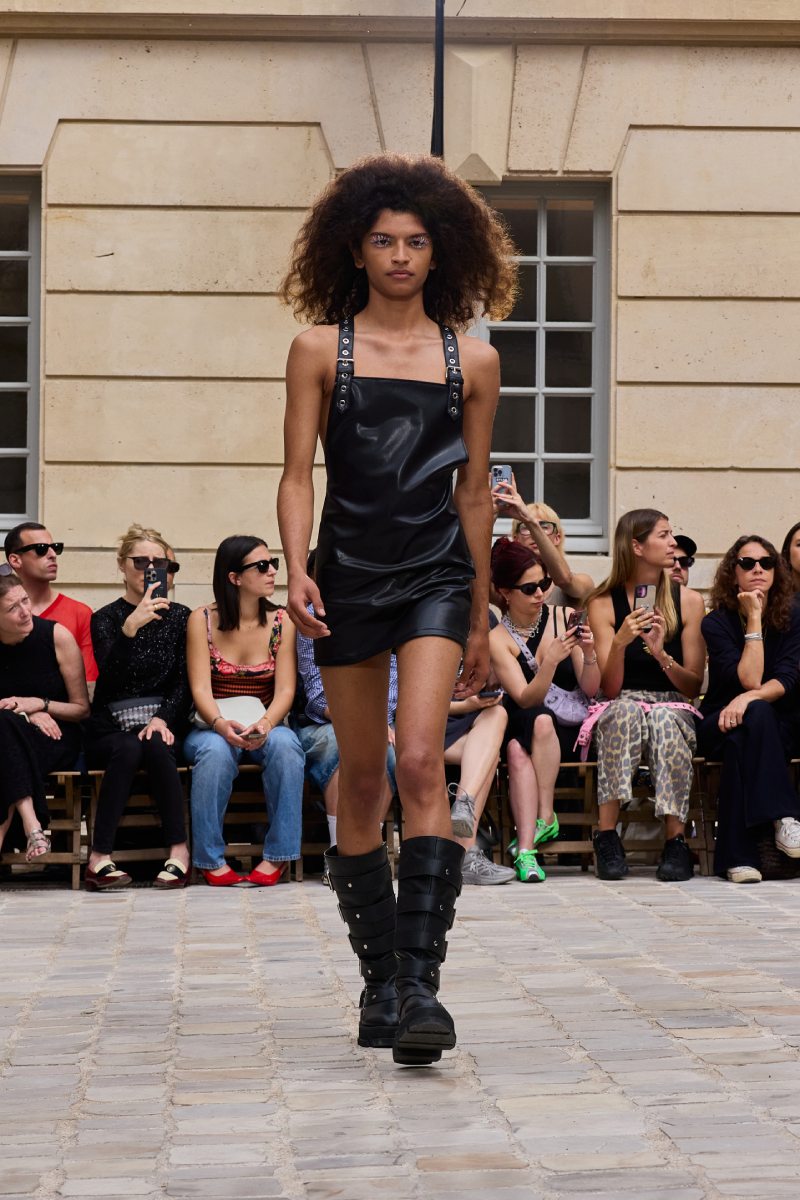 Como punto más dark, Jeanne Friot ss26 destaca también esenciales del high street en cuero negro y tachuelas, como vestidos cóctel y edgy, camisas de vestir sin mangas, faldas, jorts. Las camisetas gráficas también son uno de los puntos más literales de la colección, plasmando mensajes súper explícitos como pieza central de sus looks.