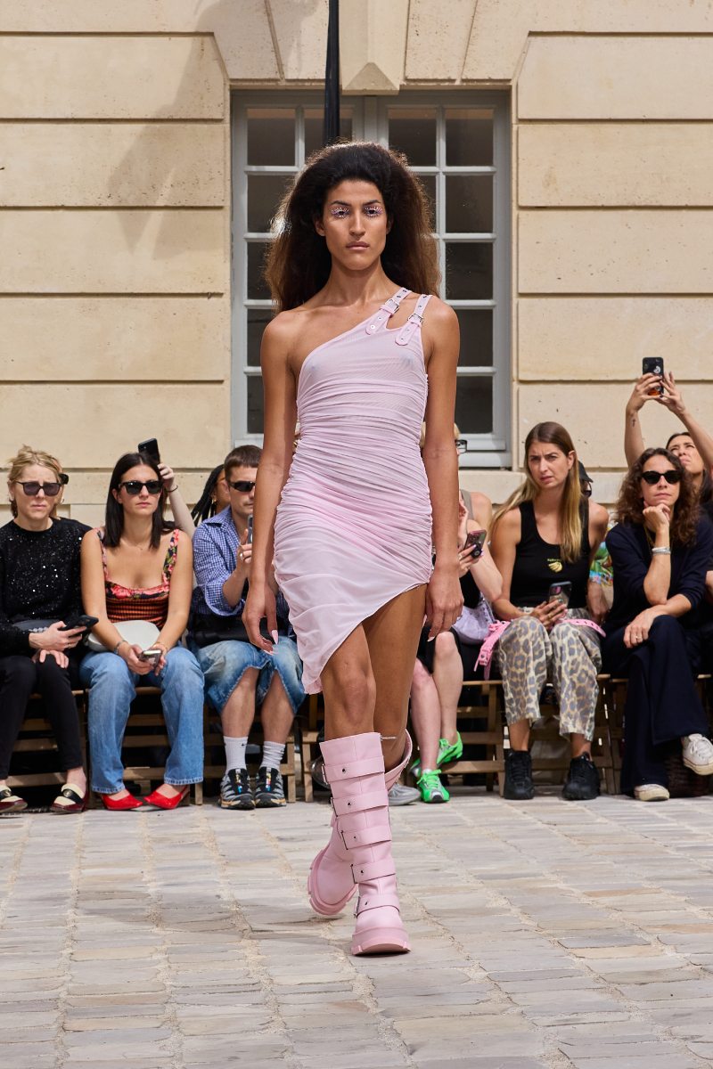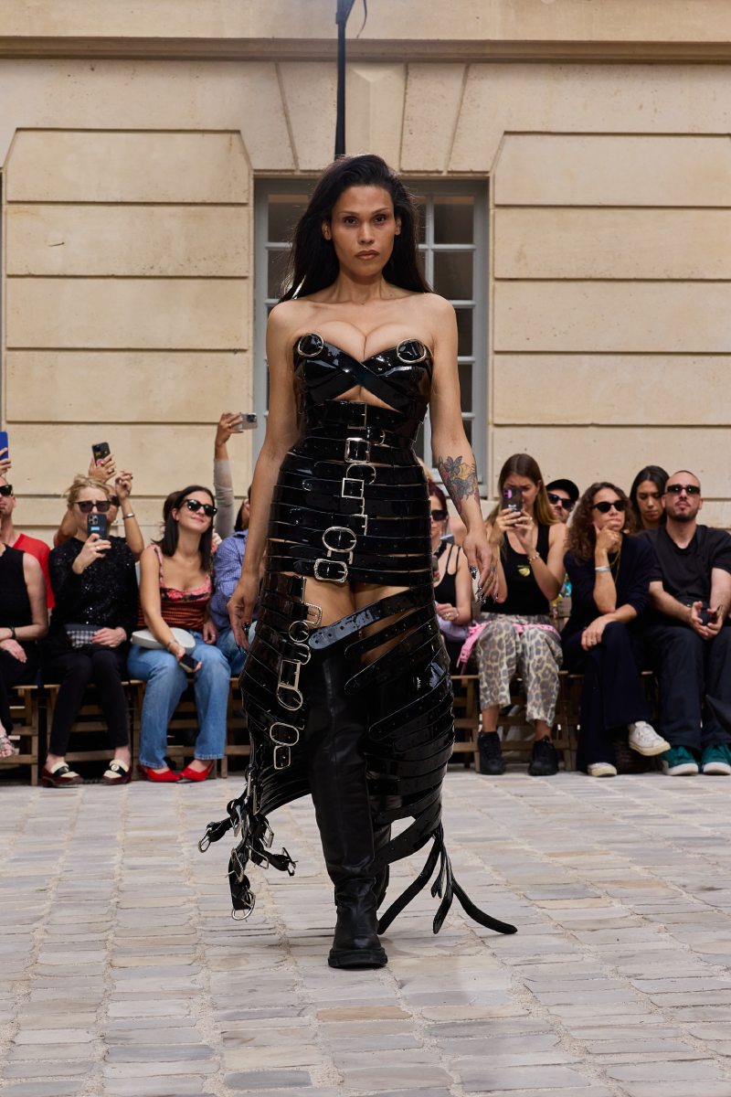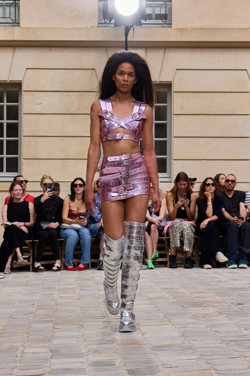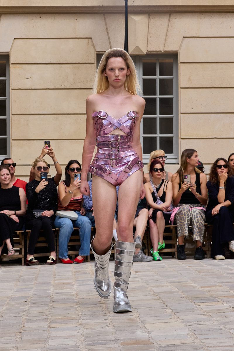 Pero ojo: no todo es puramente un fondo de armario street. También hay piezas más elevadas dentro de Jeanne Friot ss26. Por ejemplo, debajo de una bomber rosa de correas vemos unos pantalones a juego, pero que se acentúan con flecos súper dramáticos. También vemos un chaquetón reimaginado en faux fur blanco, haciendo eco del estilo de los 2000. Y bueno, también están los tops, faldas y vestidos construidos con cinturones que se acentúan con un acabado metálico a lo Y2k (y ojo con el negro del final).