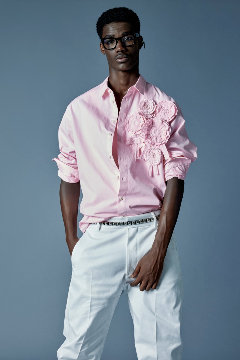 Empezando por el lado masculino de DSquared2 ss26, la colección juega con proporciones generosas en cazadoras y chaquetas de aire urbano y vemos desde lo más simple, como prendas de sportswear ochentero, a lo más complejo: una chaqueta varsity rosa decorada con apliques de flores (motif que se repite a lo largo de la colección). Entre medias, salen a relucir vaqueros y prendas de chándal de corte holgado, cinturones studded y un fuerte punto de ropa deportiva (reimaginada con estampados animales y detalles más histriónicos, claro). Las camisas de botones y los trajes baggy completan este armario.