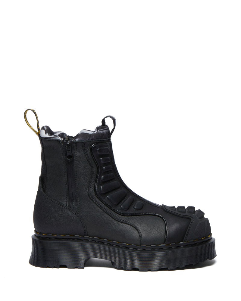 Y para cerrar el Dr. Martens Protect Pack, tenemos un modelo no tan popular (pero igual de icónico). Esta reinterpretación de clásicos trae también el modelo Chelsea 2976 en su versión más atrevida. El upper se acentúa con un empeine con paneles de protección texturizados que enmarcan una cremallera frontal. Y, sumando puntos de estética Y2K gótica y feísta, tenemos también una puntera engomada, reforzada con tacos. El talón también se refuerza con un panel de ante y la suela se une a través de las icónicas costuras en amarillo DM.