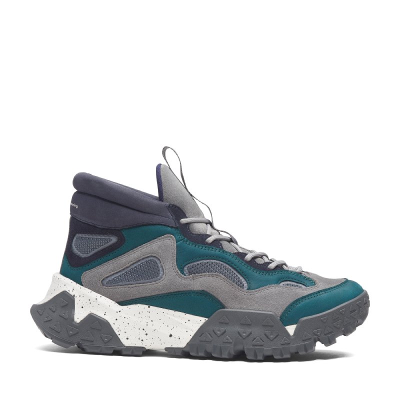 La cápsula de Timberland X White Mountaineering FW24 abre con la reedición de una de las siluetas más modernas de la marca americana. Claro, con el twist más elevado y utilitario de WM. Esta nueva versión reimagina las siluetas hiking con formas más futuristas y afiladas en sus paneles. En cuanto a construcción, tenemos una base de mesh transpirable ReBOTL subordinada bajo paneles de ante y cuero en escala de grises y verde. El cuello acolchado y el perfil descendente de este modelo acercan más esta silueta a un look de avant-garde que a un sendero, pero sirven para ello igual. ¿Cómo? Gracias a su suela, robusta y chunky de EVA blanco moteado que se acentúa con paneles de tacos gruesos.