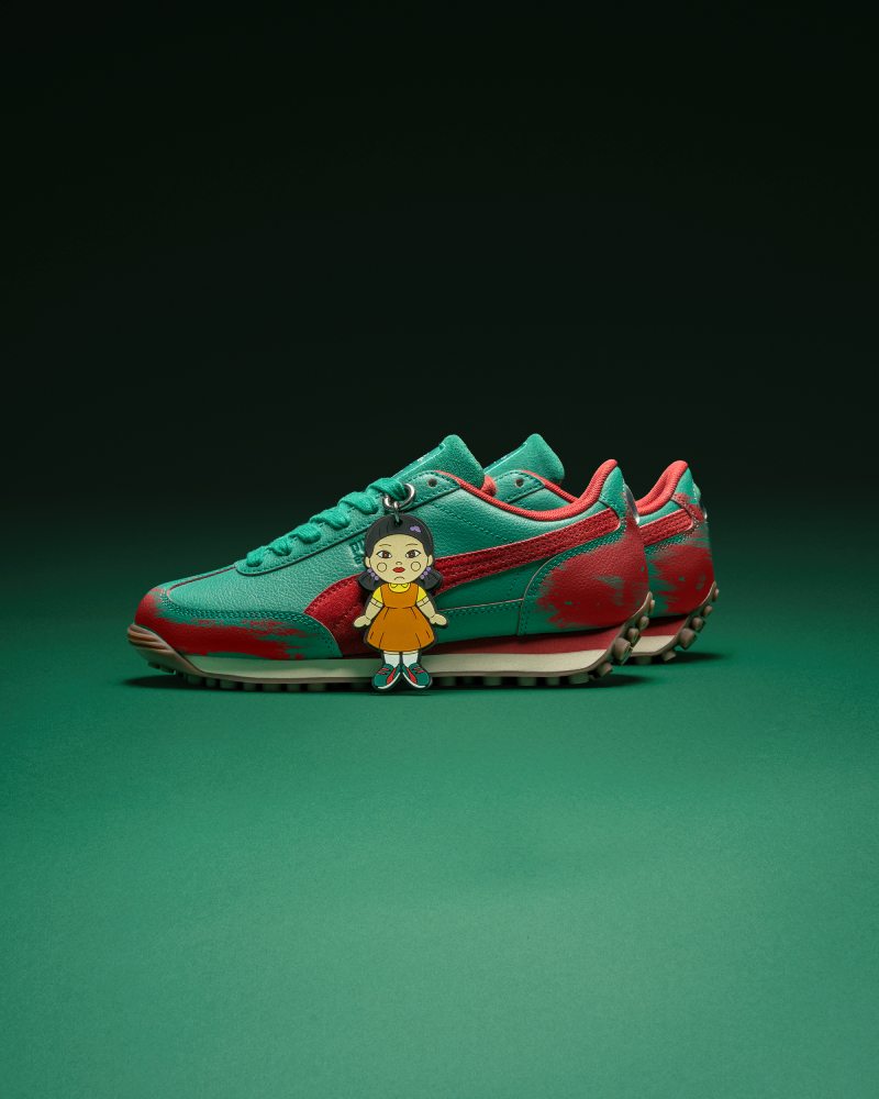 La cápsula colaborativa de Puma X El Juego del Calamar abre con sus siluetas de zapatillas. La primera silueta que recibe el tratamiento de esta estética es la Easy Rider, que toma inspiración del juego luz roja, luz verde en su colorway. El cuerpo superior se construye de cuero verde que, al irse desgastando y raspando, muestra una capa inferior en rojo. La zapatilla también cuenta con un charm de la muñeca Young-Hee y un Formstrip de ante rojo. El look cierra con una mediasuela clásica de goma blanca y una base en color gum.