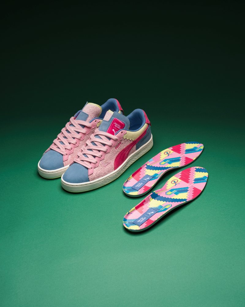 Seguidamente, la colabo de Puma X El Juego del Calamar presenta la silueta Suede con un colorway inspirado en la escena del juego de las escaleras. El upper se construye de ante y presenta paneles dentados en colores pastel y un tag exclusivo en la lengüeta. Como detalles ocultos, la plantilla interior se estampa con un motif geométrico de escaleras y todo cierra con una suela clásica en blanco.